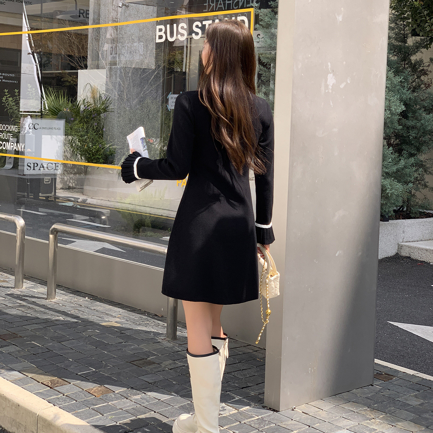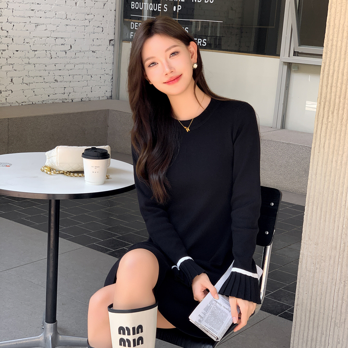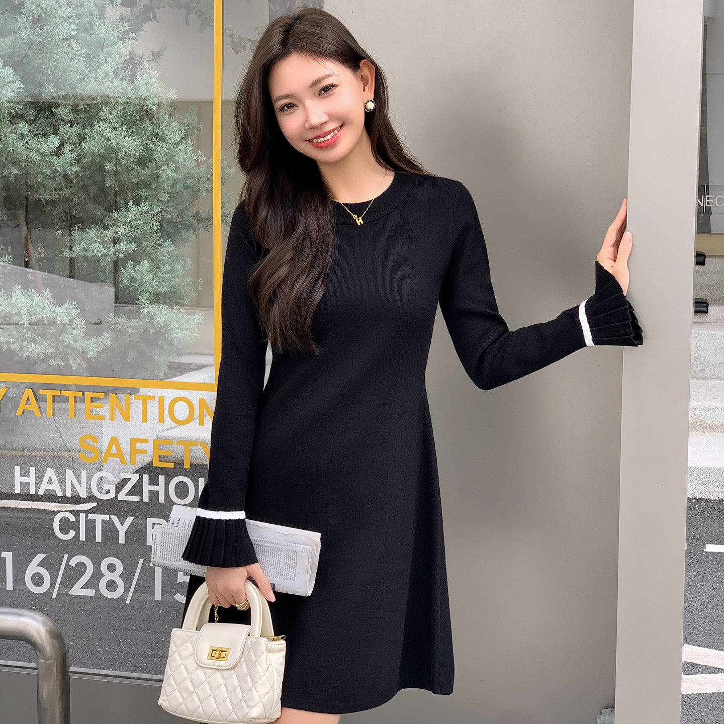黑色长袖连衣裙女秋冬小个子中长款毛衣内搭针织a字裙打底毛衣裙