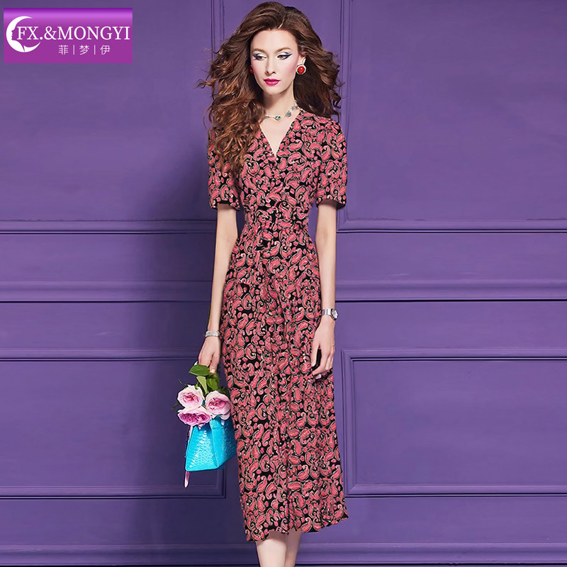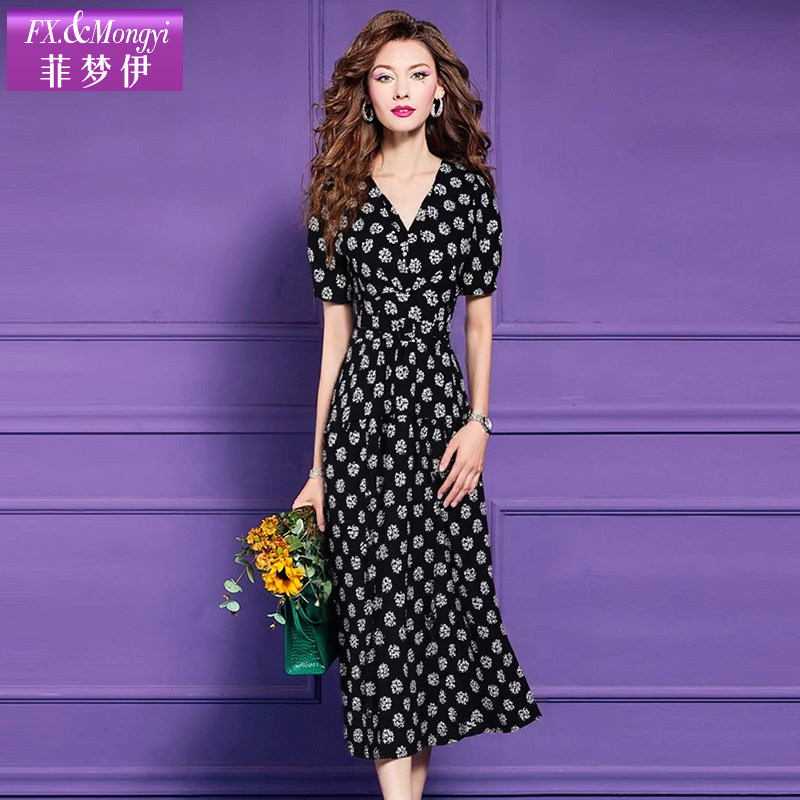 菲梦伊印花黑色连衣裙女短袖夏季复古轻熟收腰V领妈妈大码中长裙