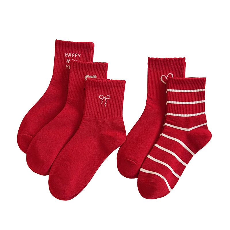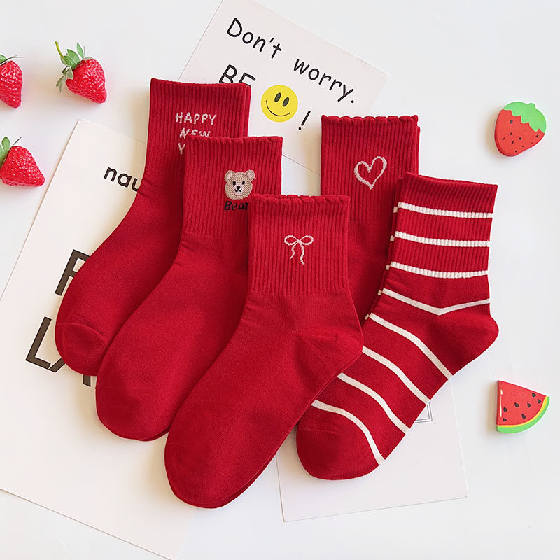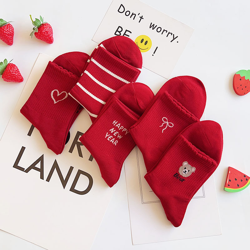 爱嘀嗒青少年红袜子新年属马大红色本命年爱心条纹中高筒过年潮袜