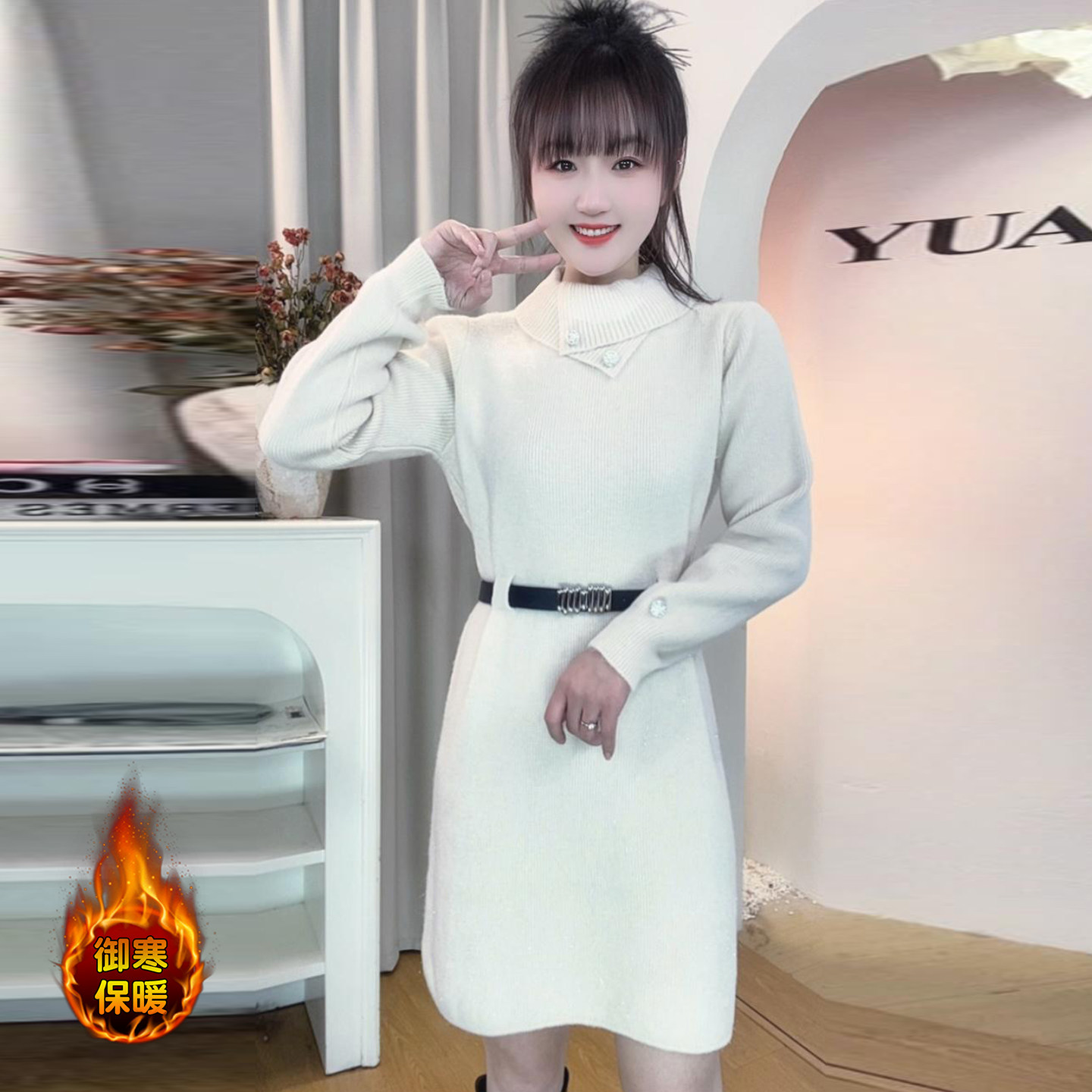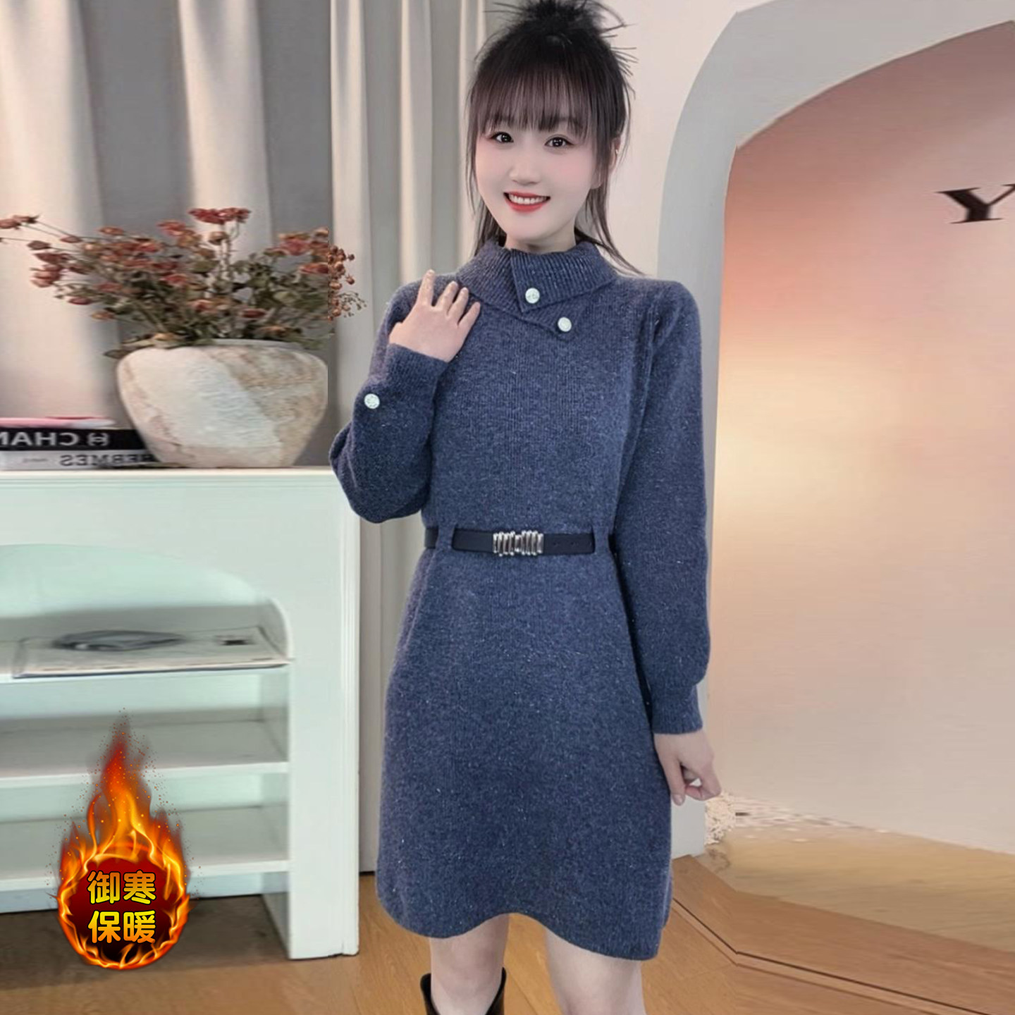 中长款收腰显瘦针织连衣裙女冬季新款时尚气质显瘦半高领打底裙子
