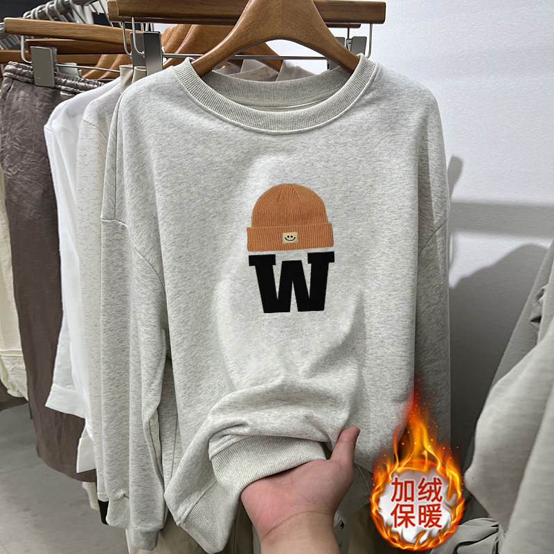 美式复古加绒加厚圆领宽松灰色卫衣女款无帽秋冬正肩长袖上衣女