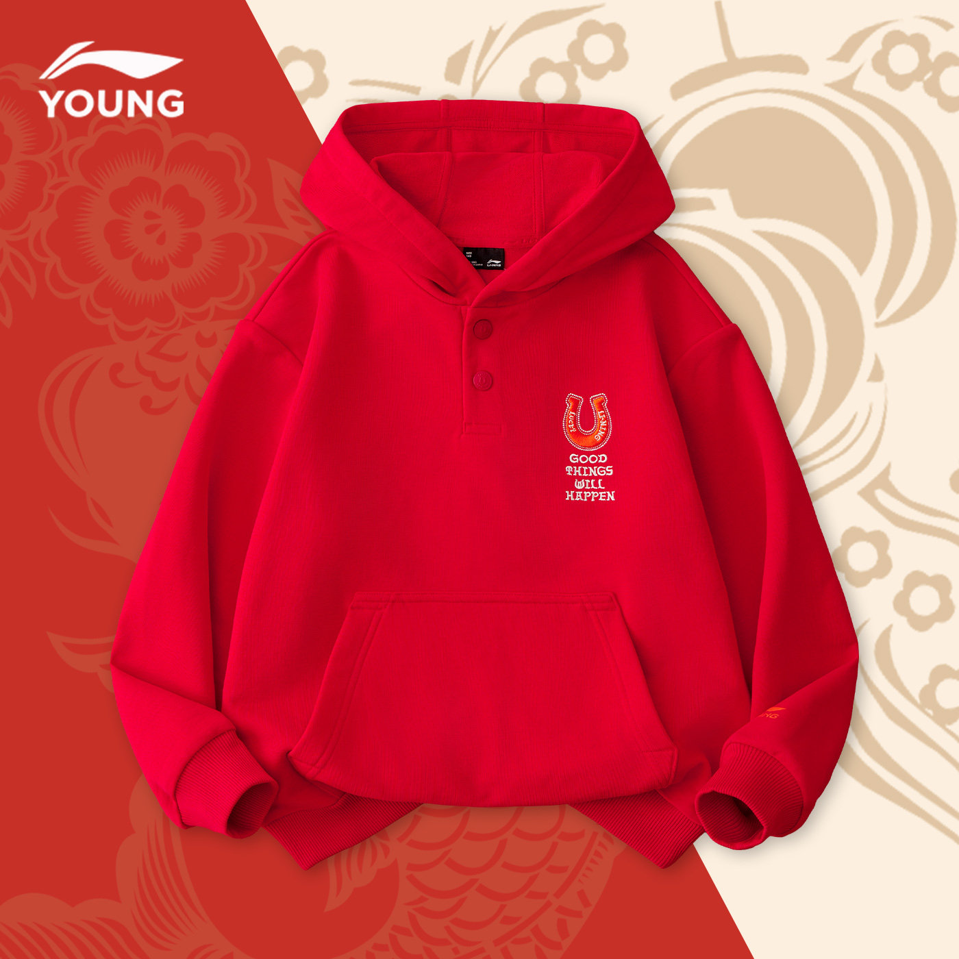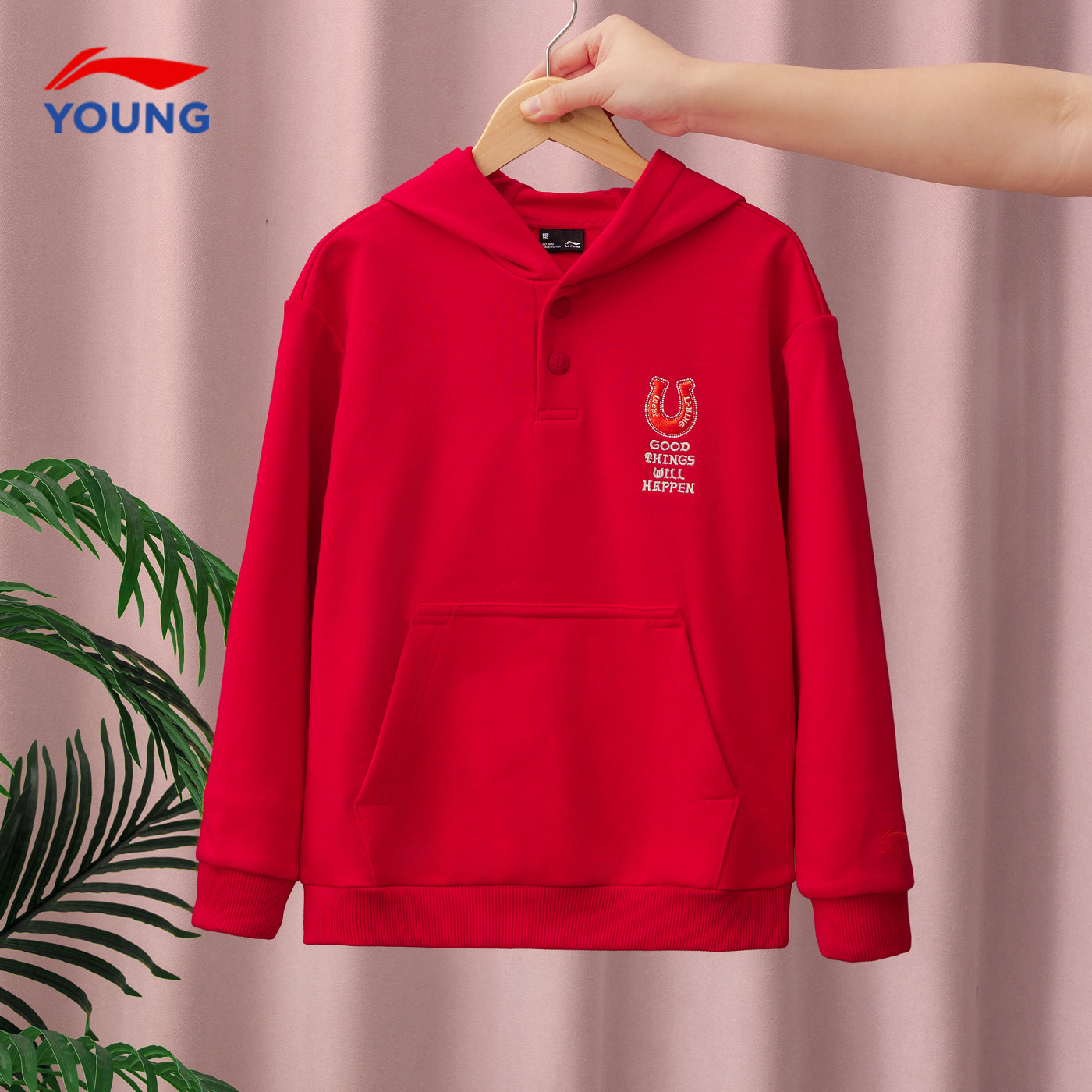李宁男童加绒卫衣男女童2026新年款红色本命年青少年保暖连帽上衣