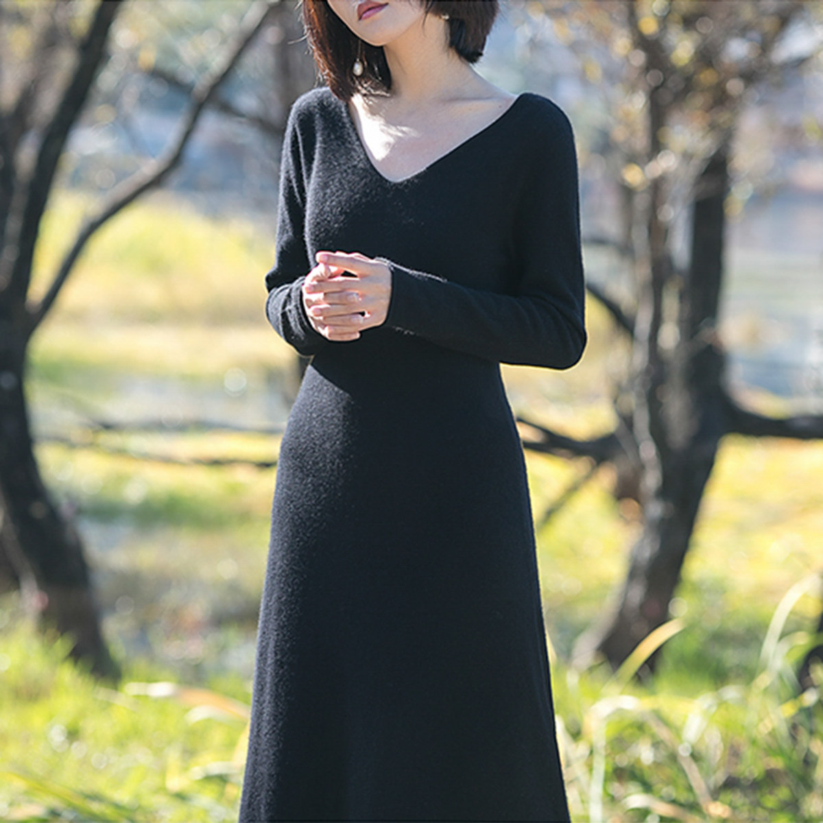 秋冬针织法国收腰古着修身黑冬裙打底a字长款羊绒v领毛衣裙连衣裙