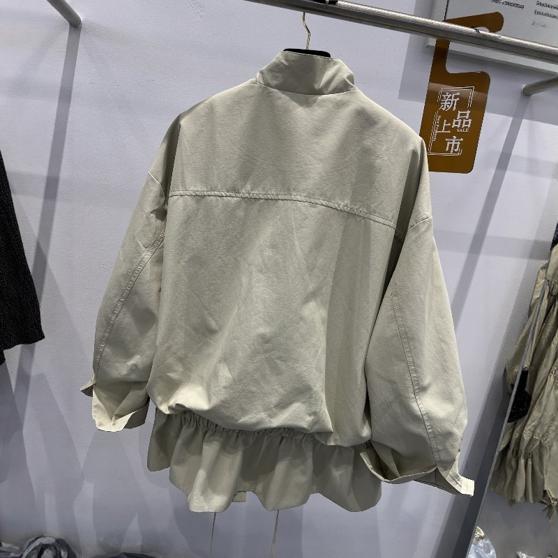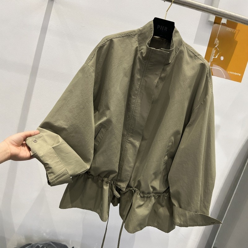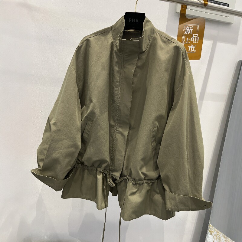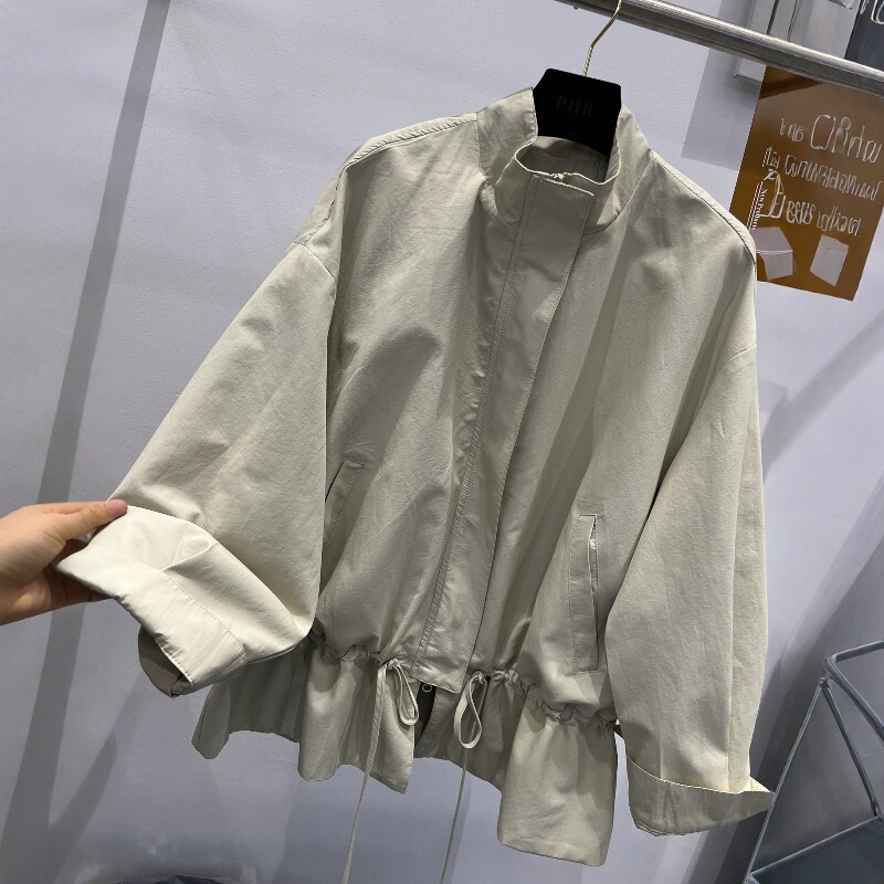 311线报网描述:立领拉链抽绳宽松休闲中长款风衣外套女上衣