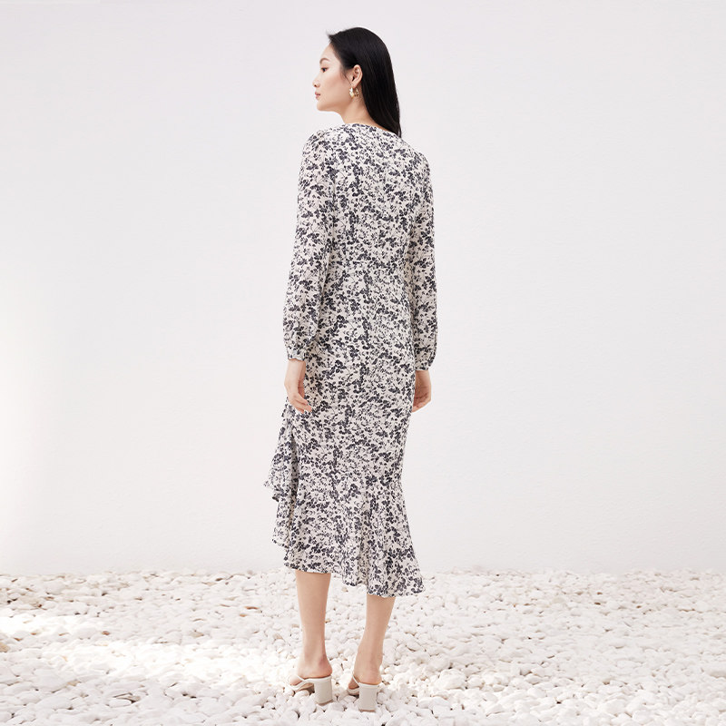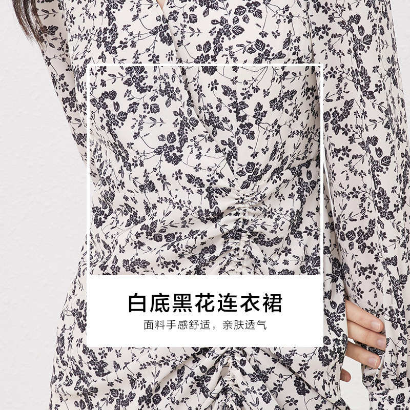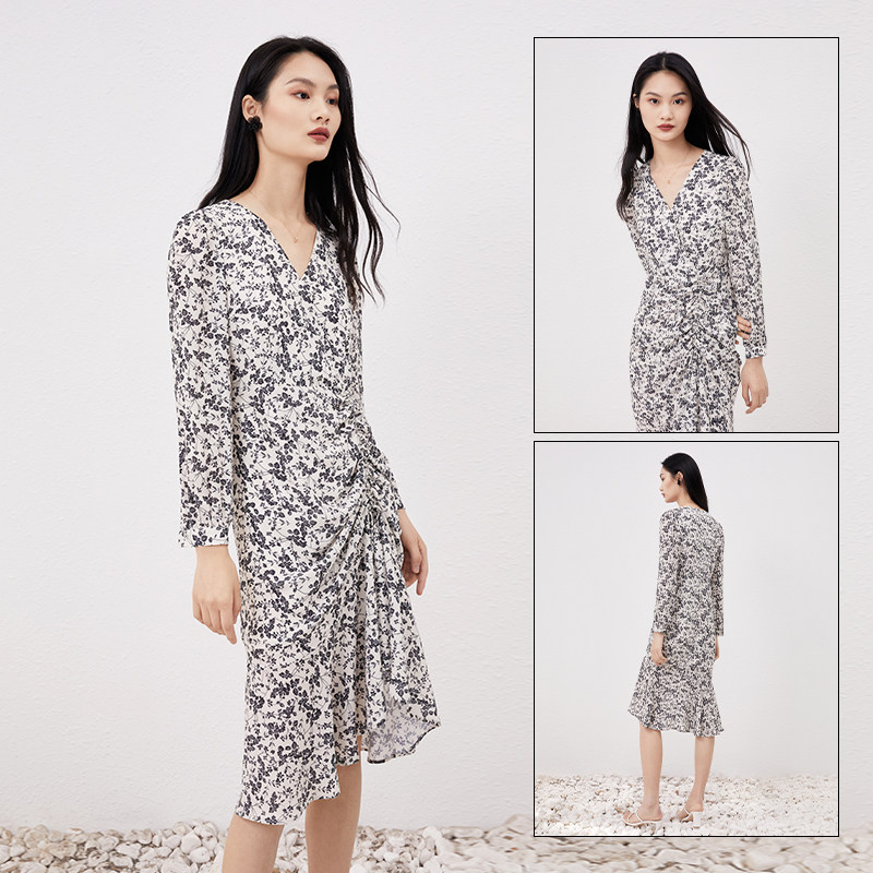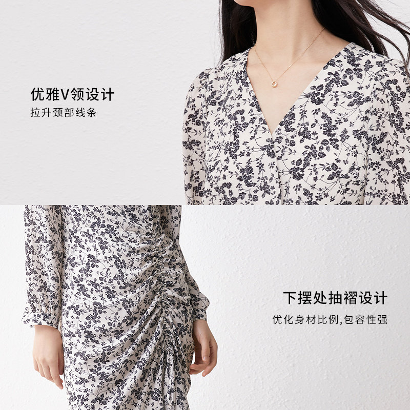 TKY SHOP抽褶V领长袖碎花裙女秋季优雅时尚中长款连衣裙淑女温柔
