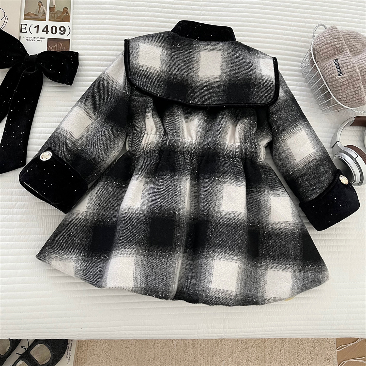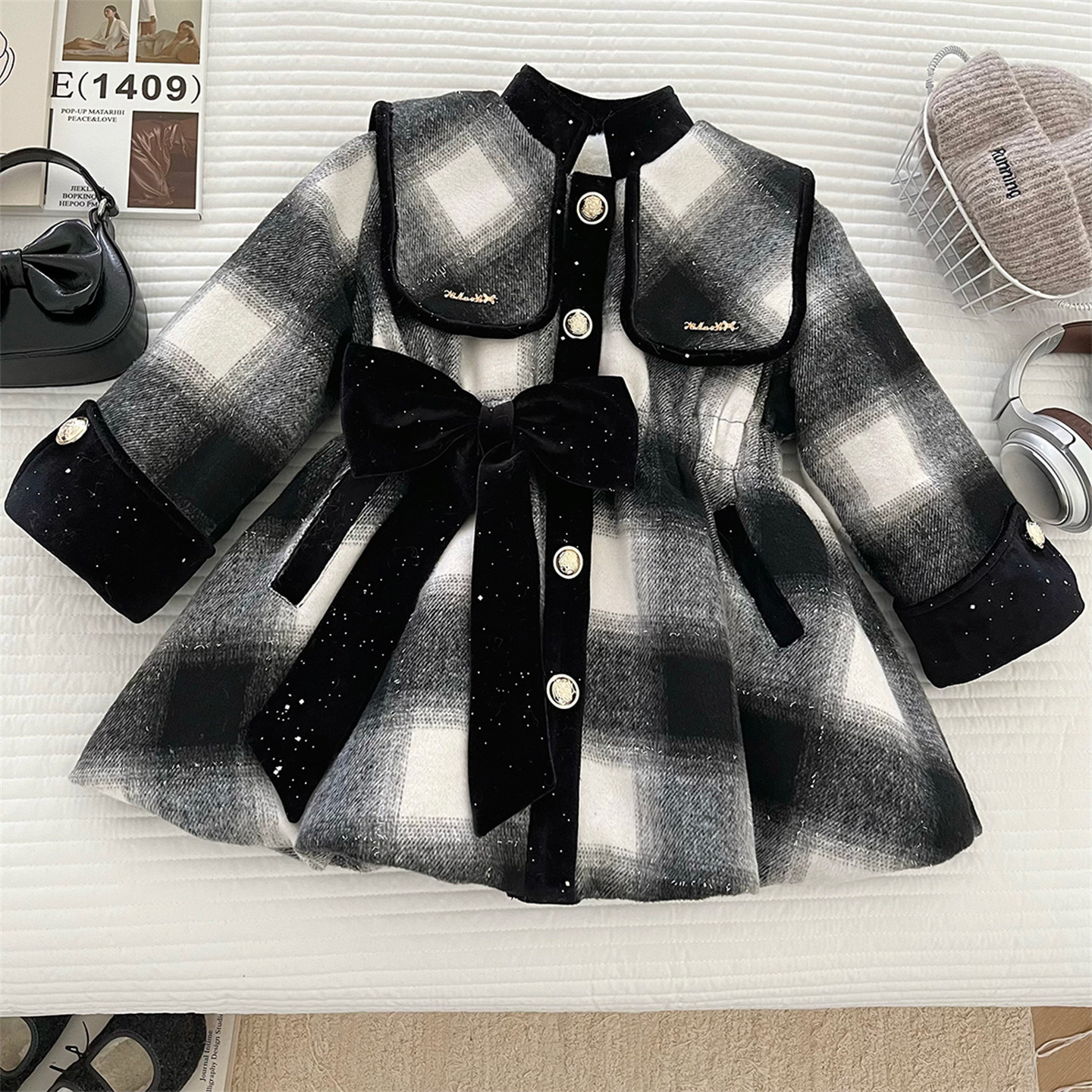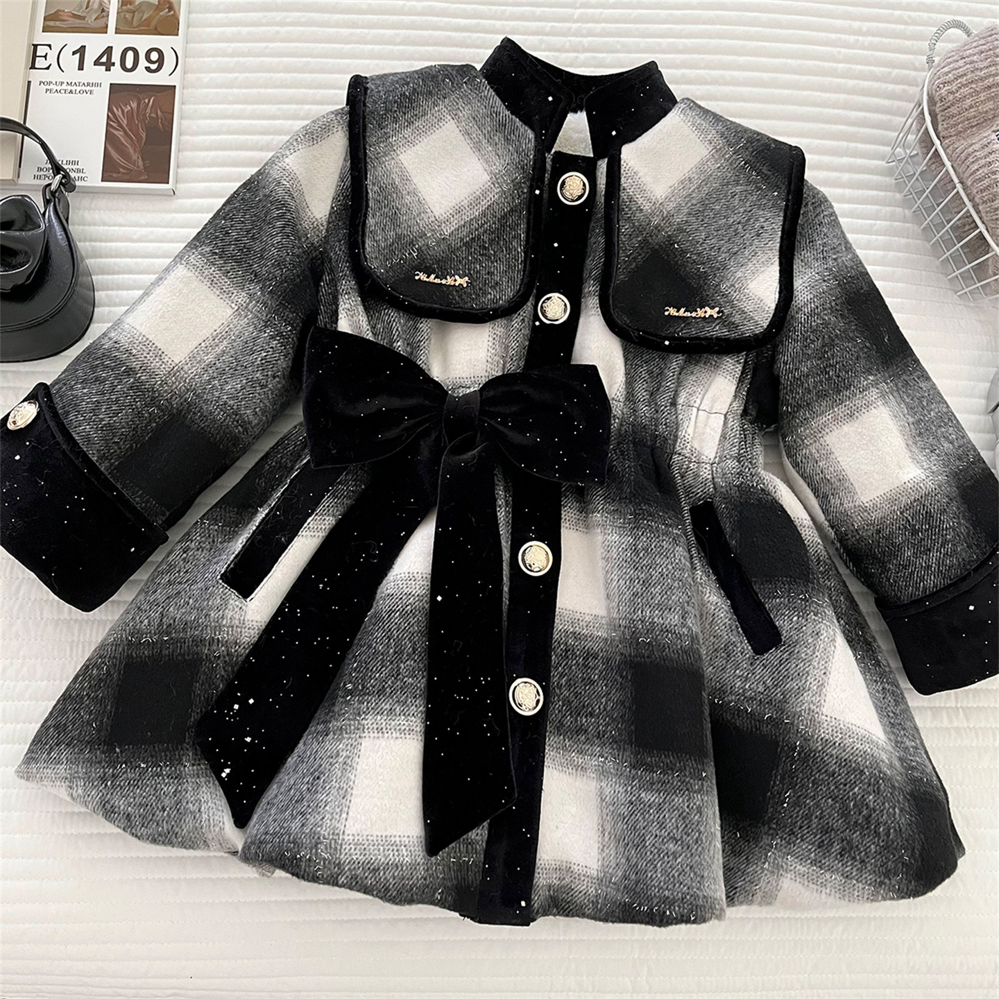 女童加绒加厚外套2026冬季新款中大童格子小香风蝴蝶结中长款大衣