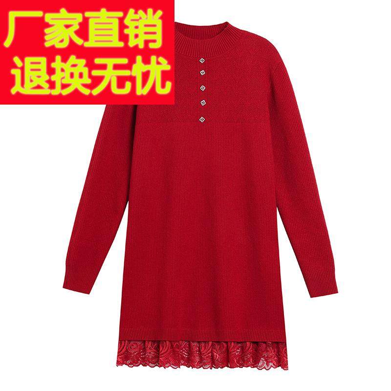 一体加绒加厚毛衣女中长款秋冬高端显瘦蕾丝针织连衣裙羊绒打底衫