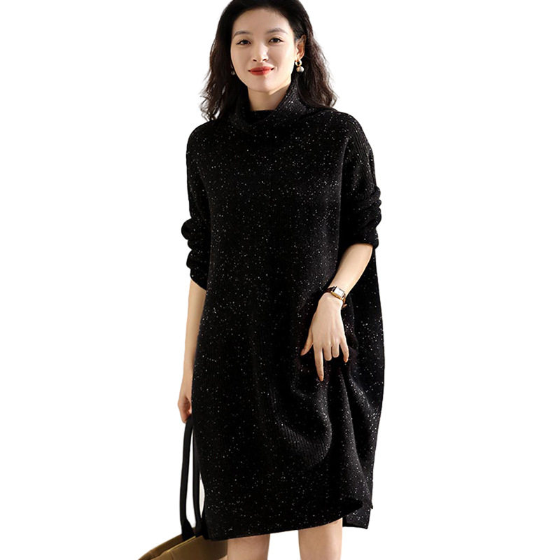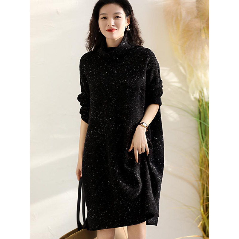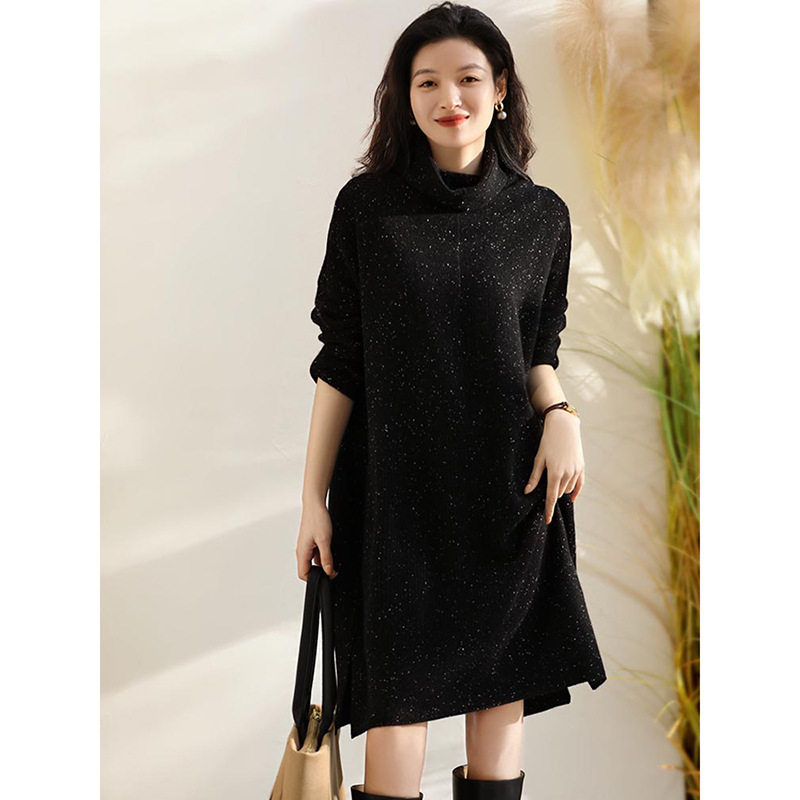 赫本风针织连衣裙女秋冬季打底配大衣亮闪闪宽松慵懒风高领毛