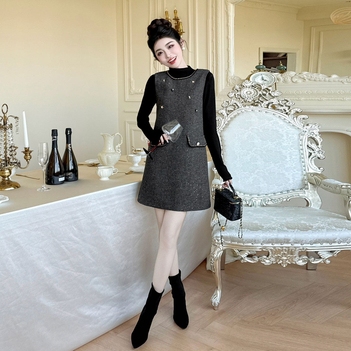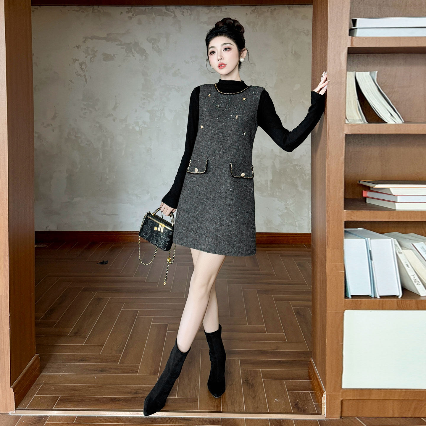 小个子ins穿搭套装女装2026新款秋冬季两件套打底衫配连衣裙套装