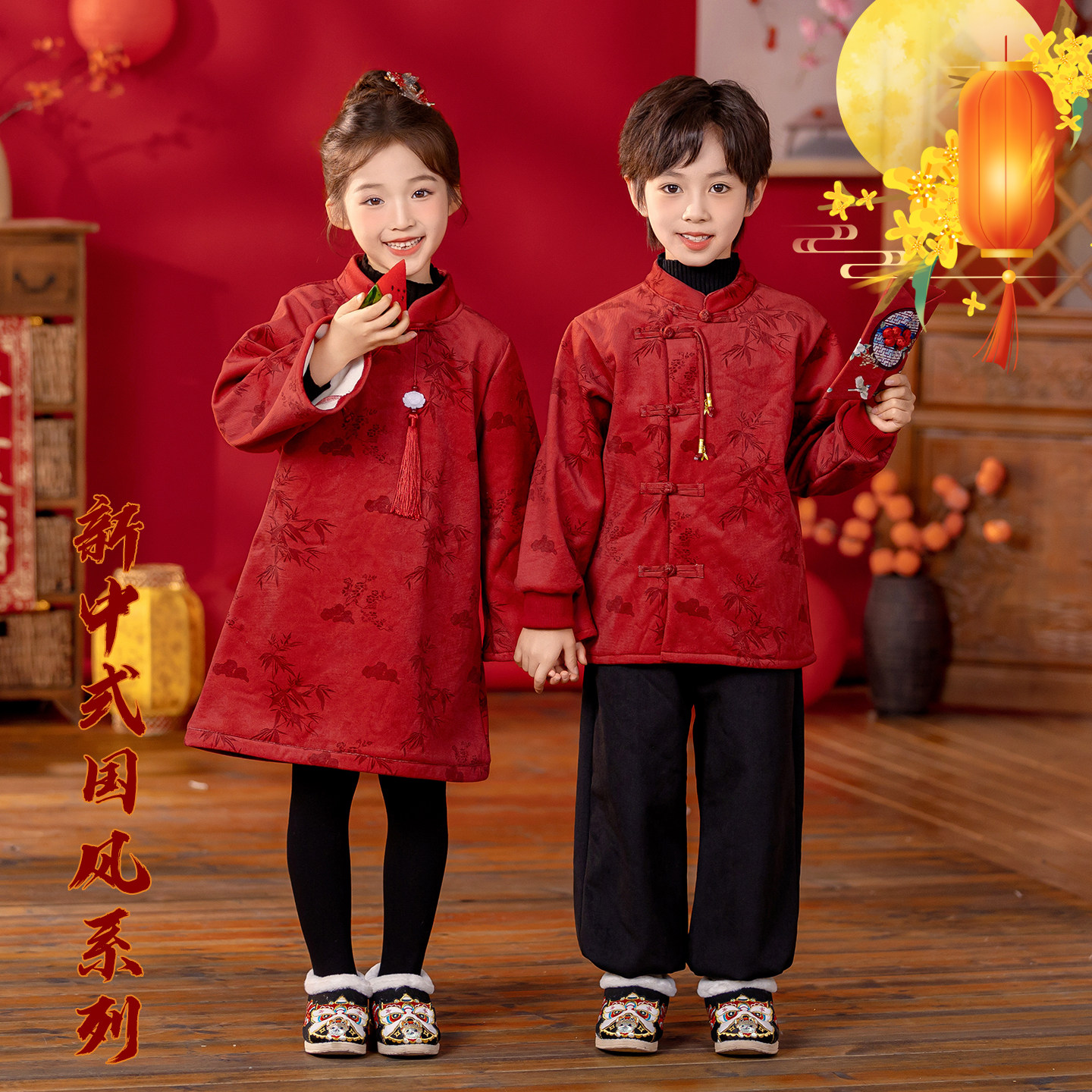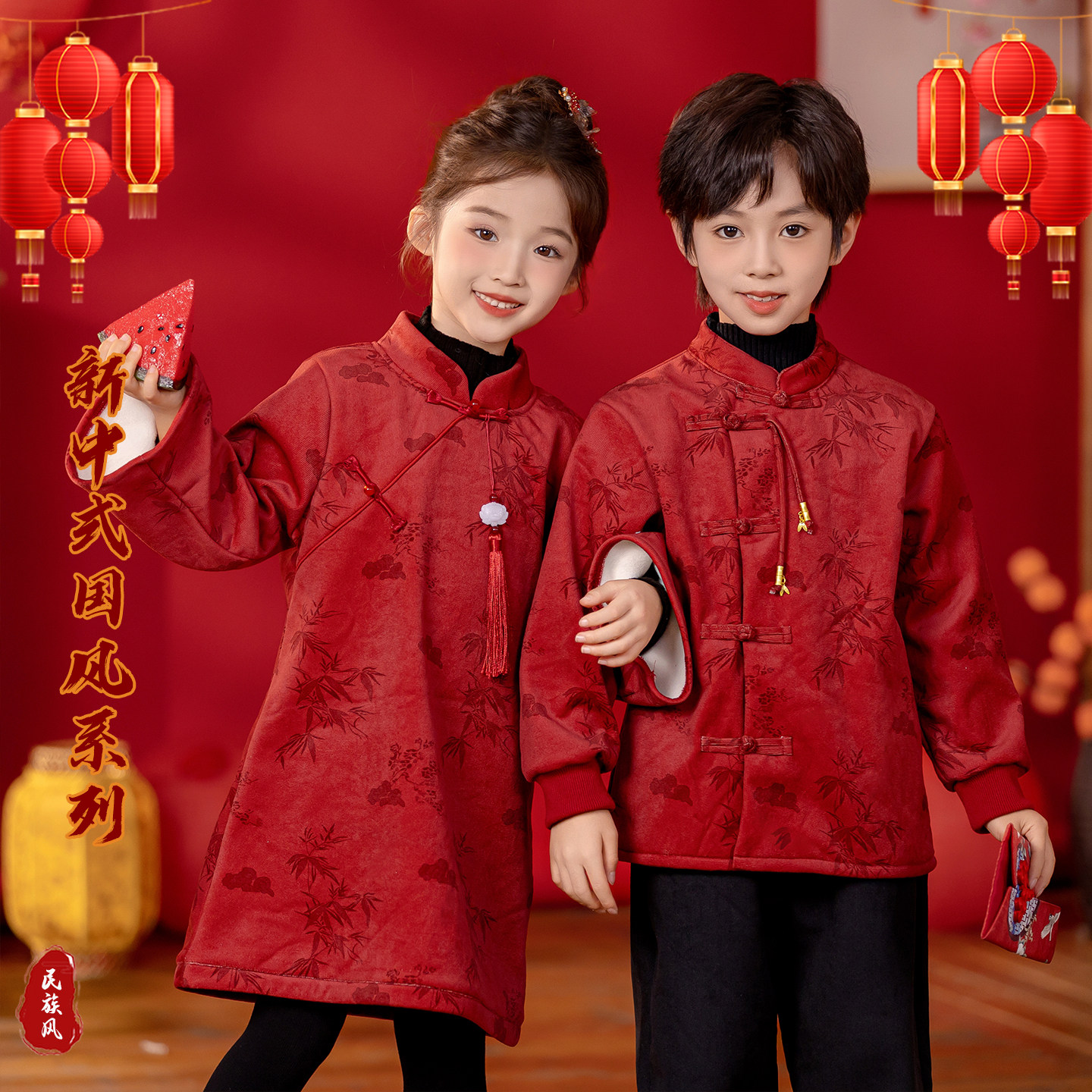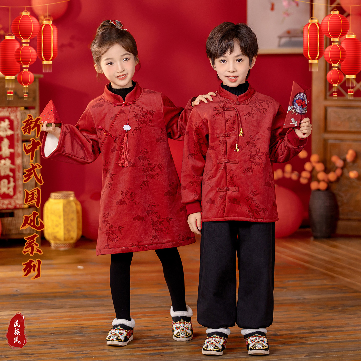 2026男童女童新年年服中国风红色中式演出服拜年服表演服加绒保暖