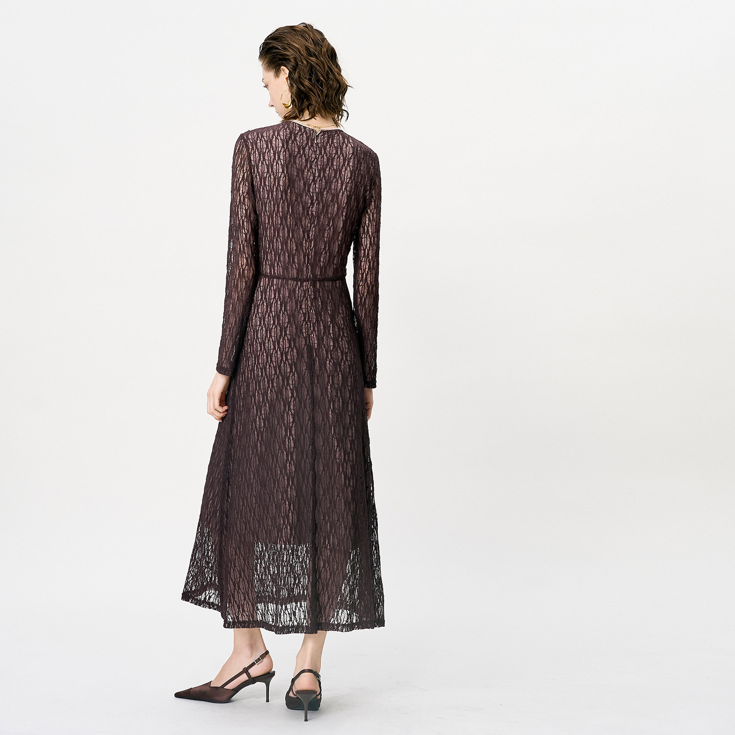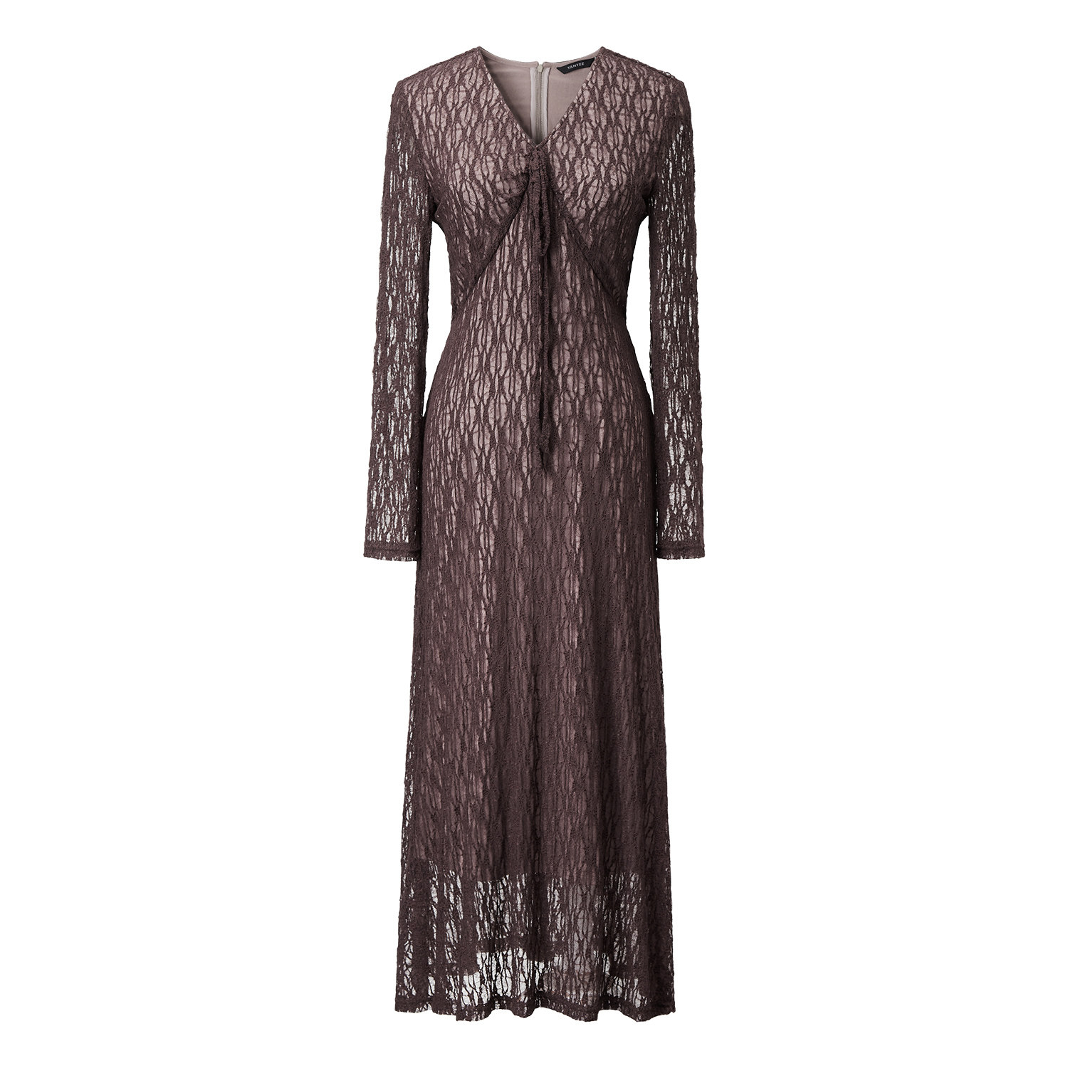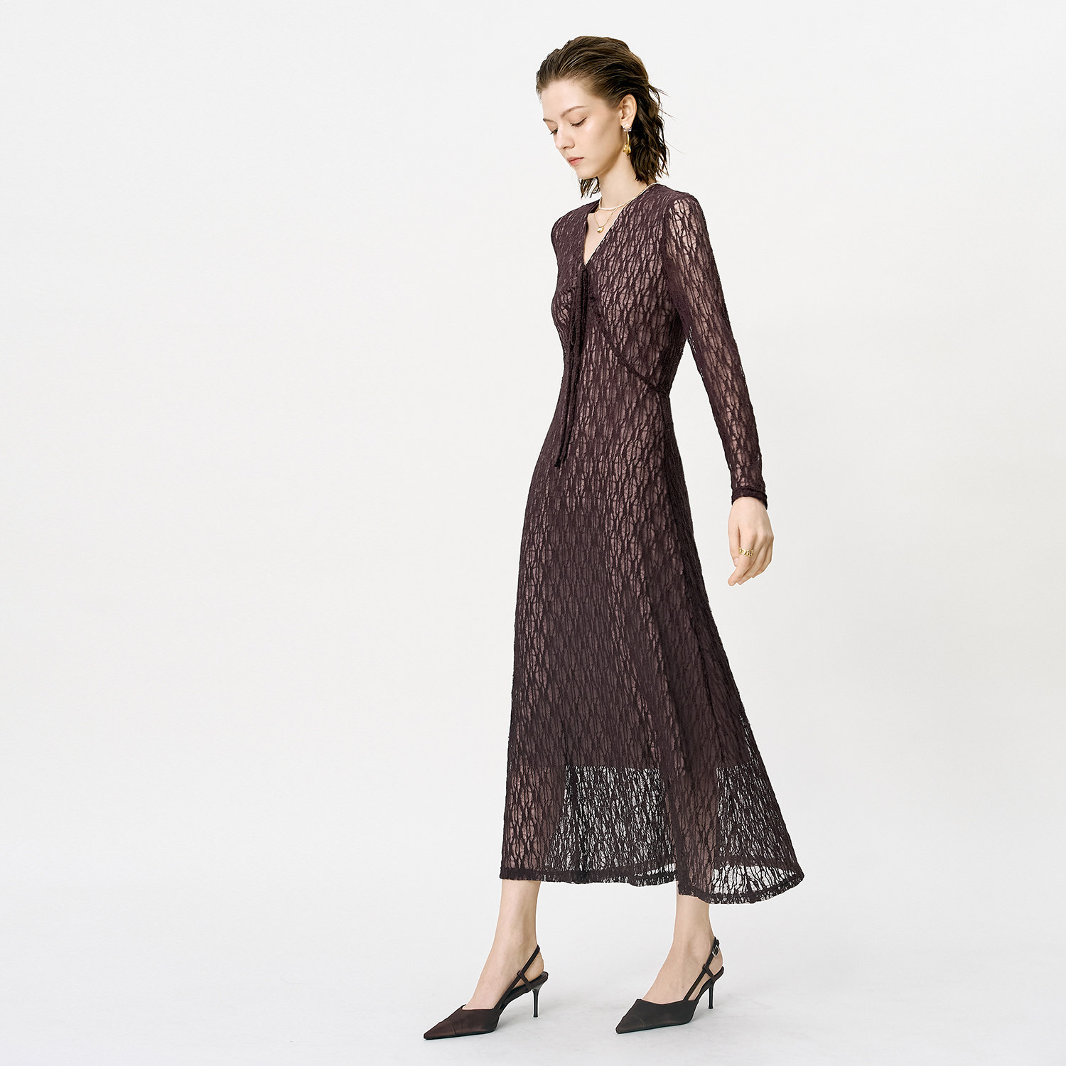 颜域蕾丝V领收腰连衣裙女2026新款春装法式复古长袖绝美气质长裙
