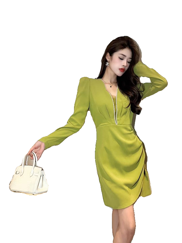 高级感纯色长袖V领镶钻收腰连衣裙小个子收腰显瘦遮肚气质包臀裙