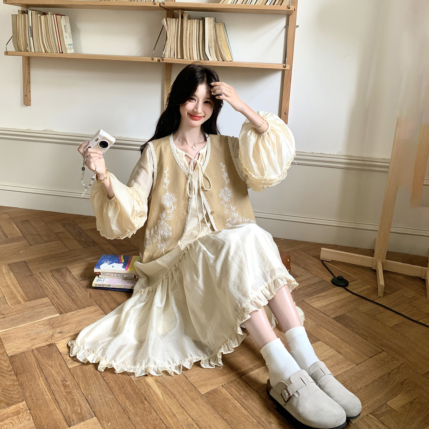 特别漂亮甜美连衣裙套装女春季2026新款爆款温柔风绣花马甲两件套