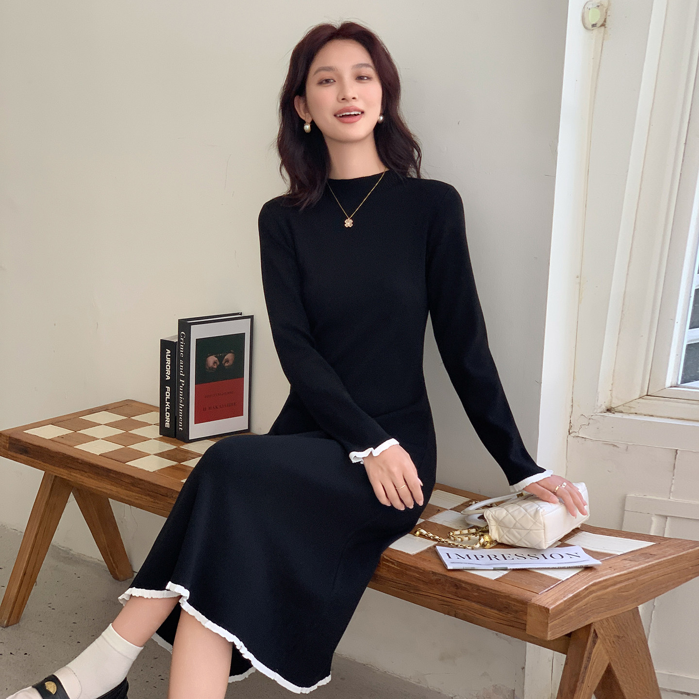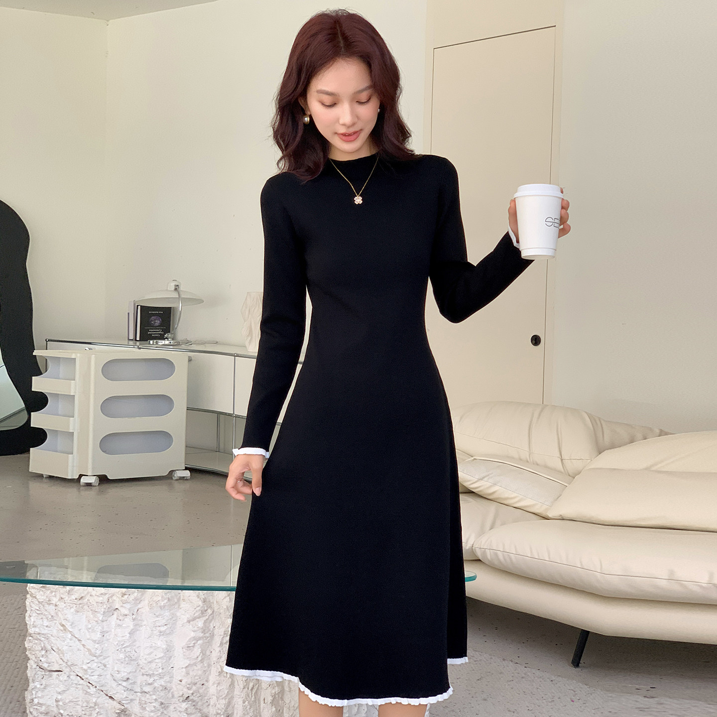 赫本风黑色修身连衣裙长裙秋冬内搭收腰半高领打底裙子长款a字裙