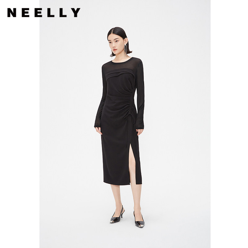 NEELLY纳俪商场同款秋新款黑色抽褶显瘦连衣裙女修身开叉长袖长裙
