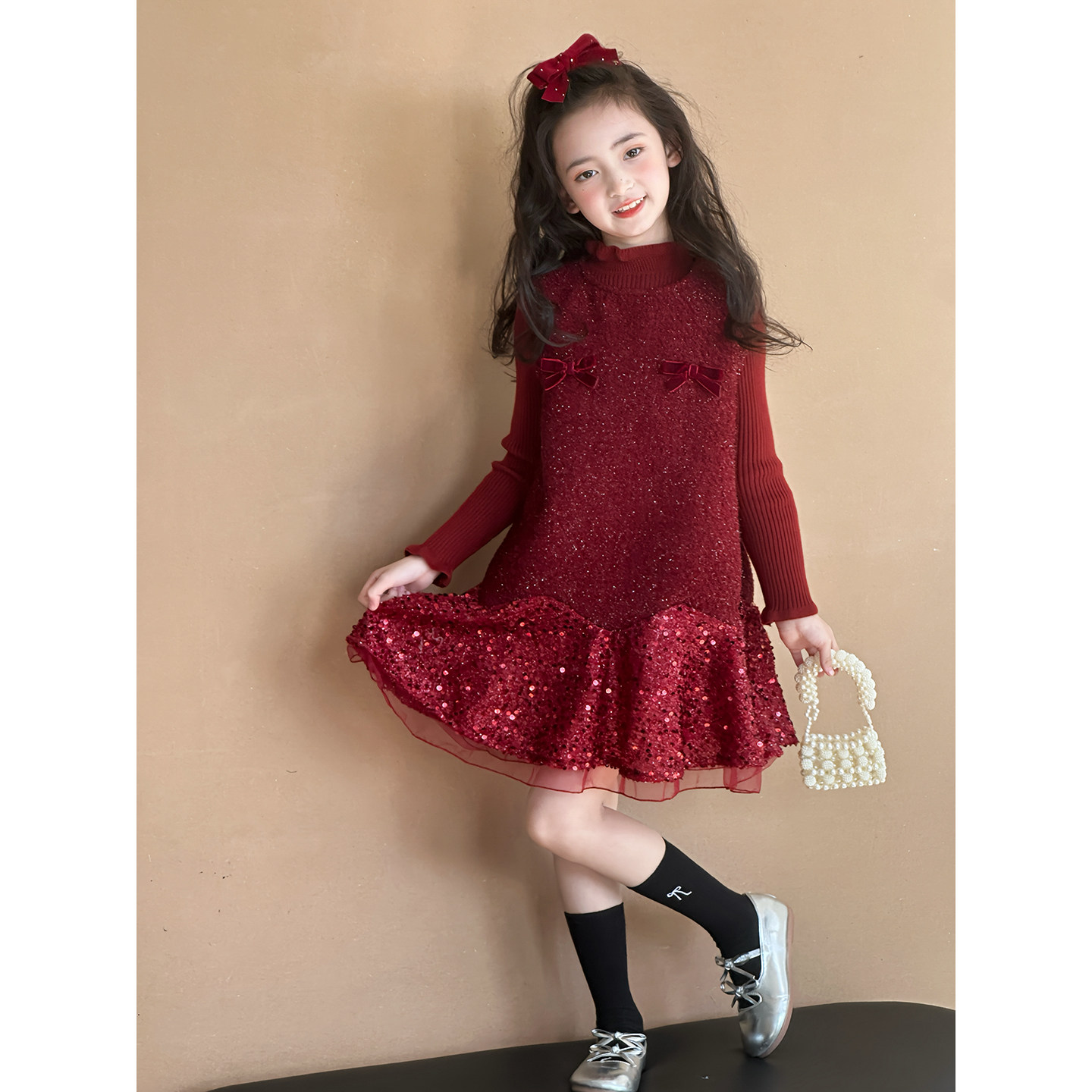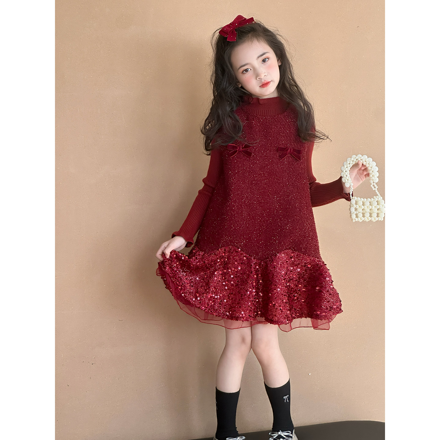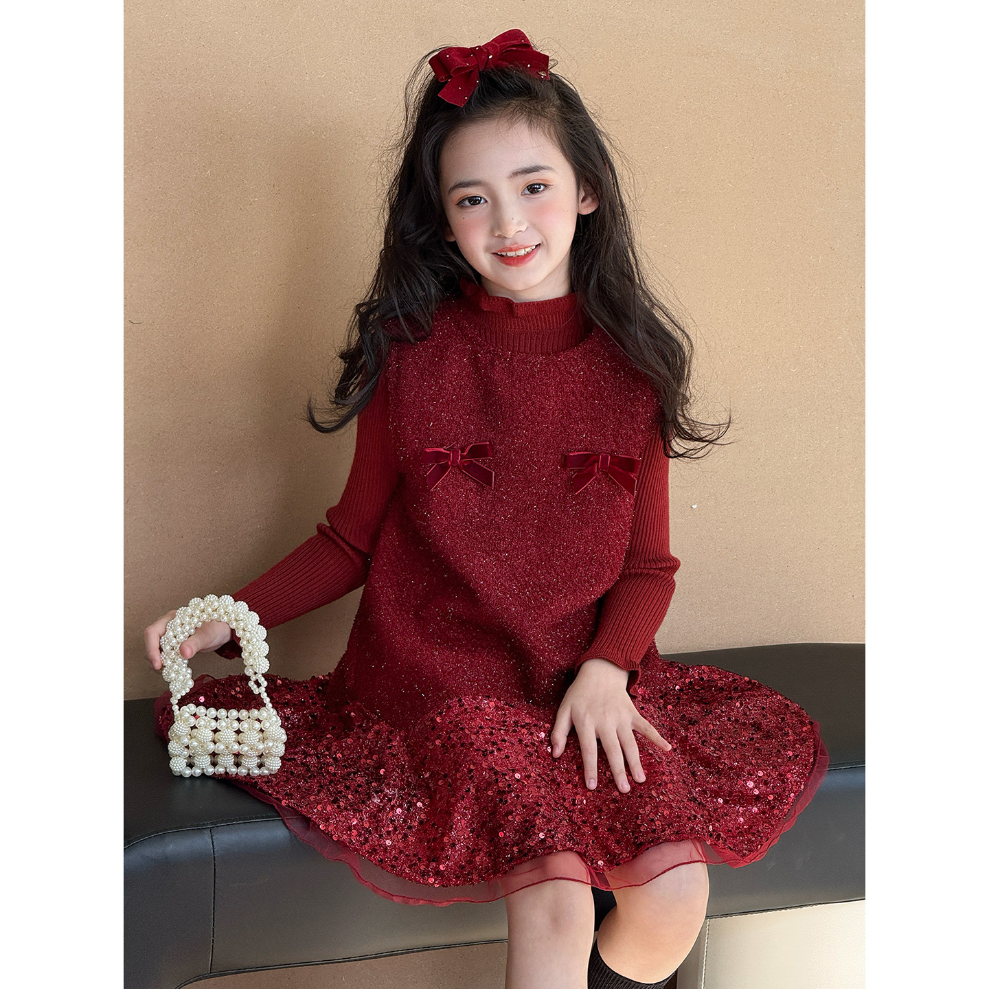 女童连衣裙套装两件套冬季新款儿童新年装加绒背心裙子洋气公主裙