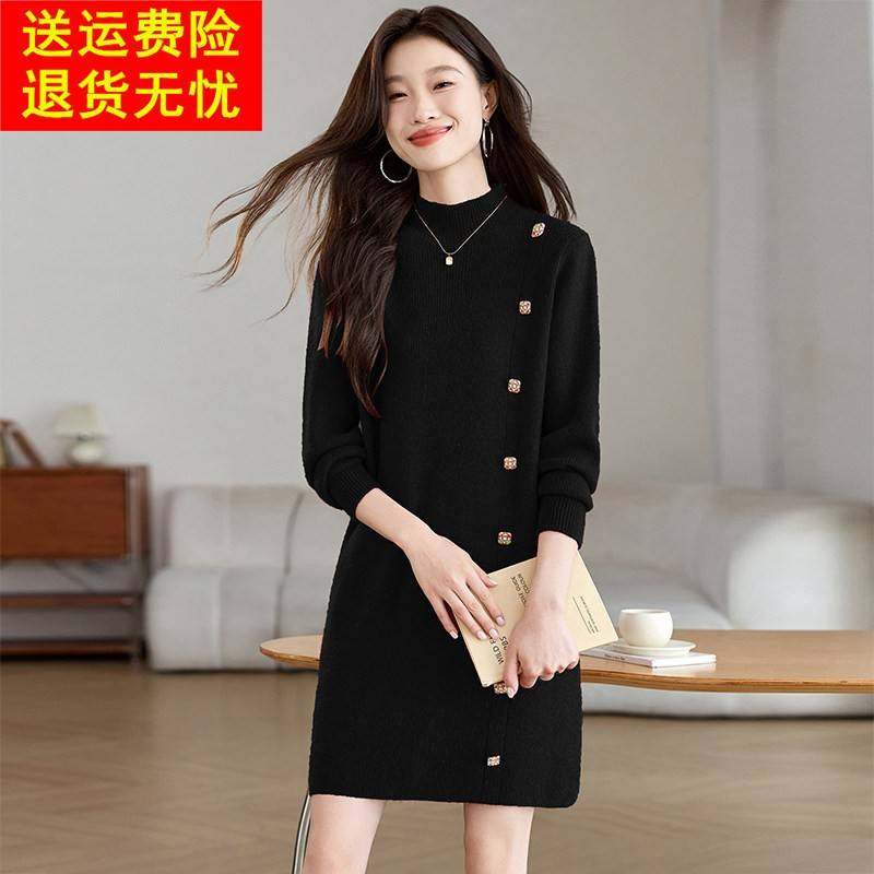 配大衣毛衣裙女秋冬季新款小个子中长款打底遮屁股羊毛针织连衣裙