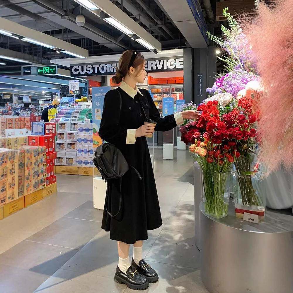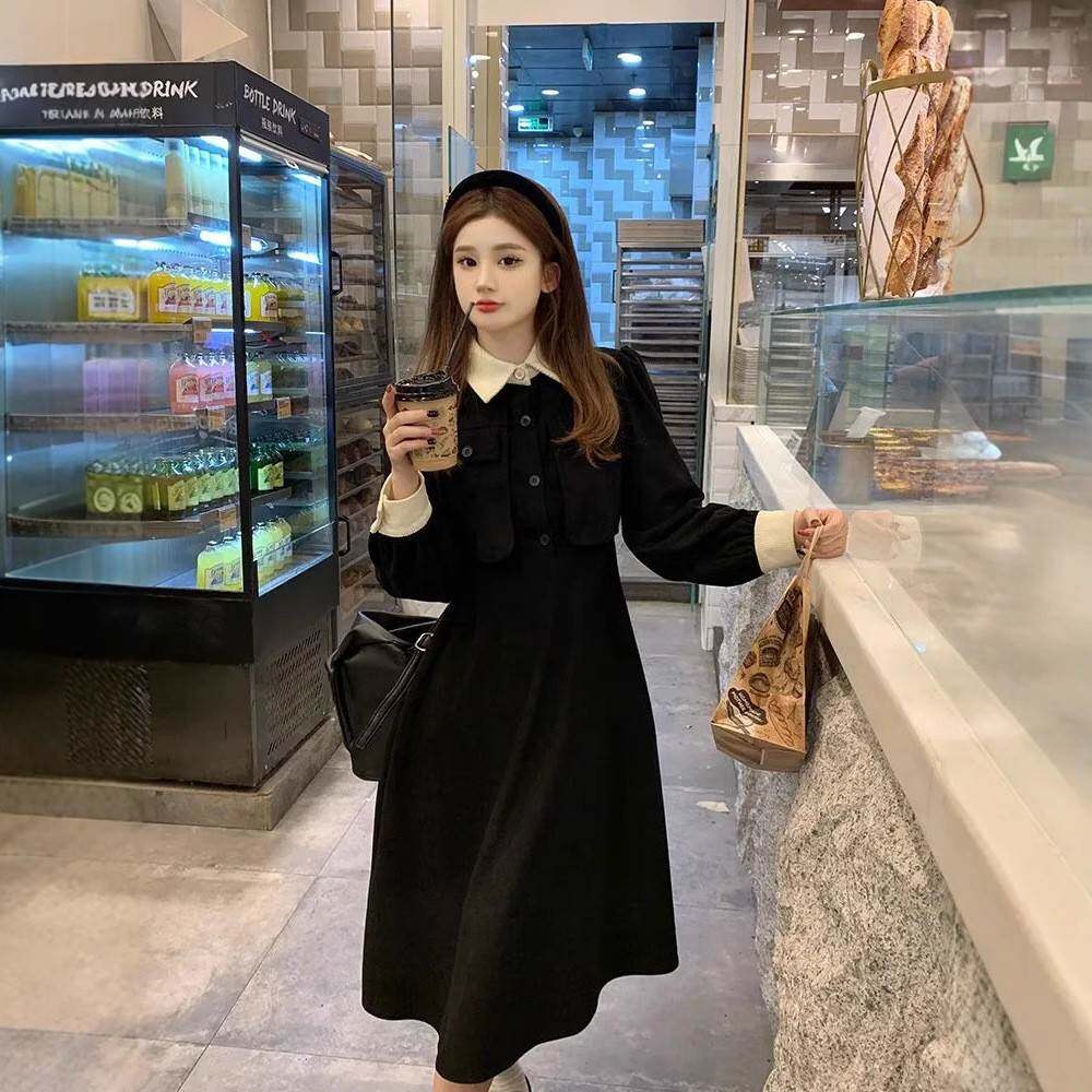 秋冬装裙子大码新款黑色法式连衣裙女秋装内搭假两件收腰中长裙