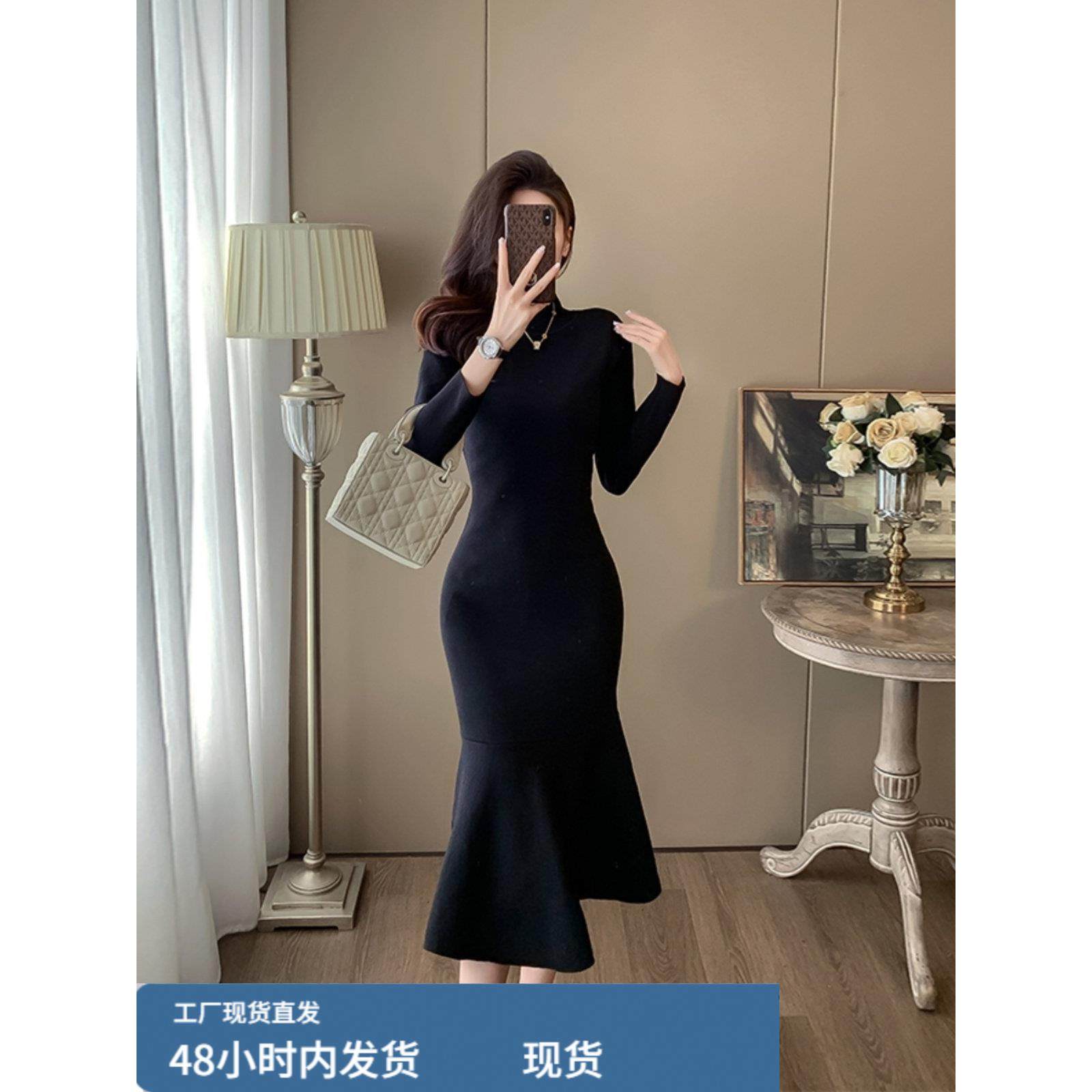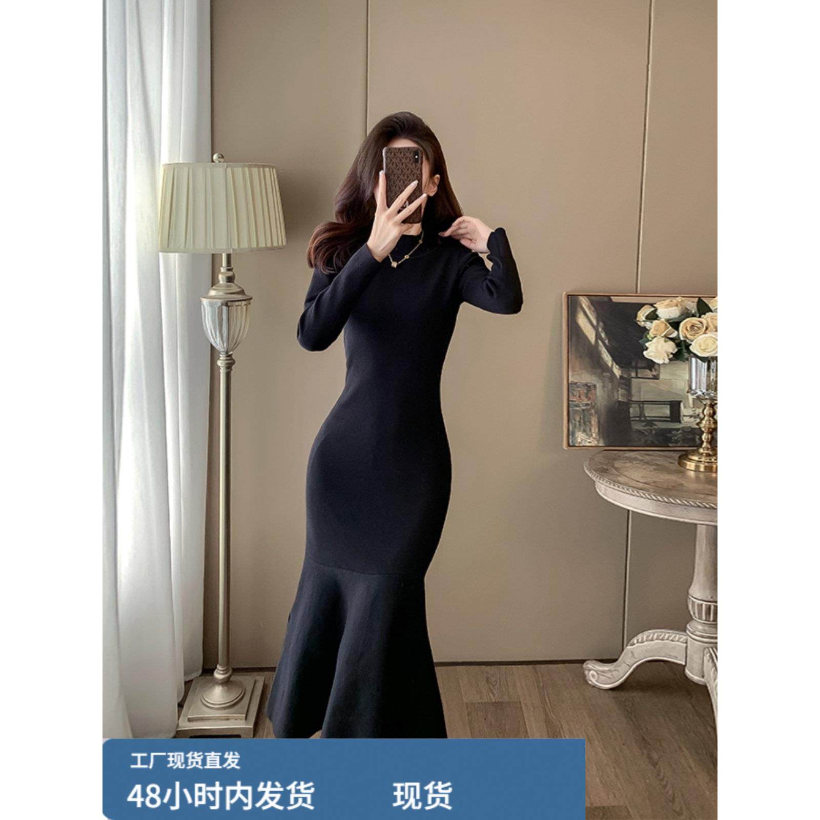 2025年春季新款半高领长袖针织连衣裙修身包臀鱼尾打底毛衣裙秋冬