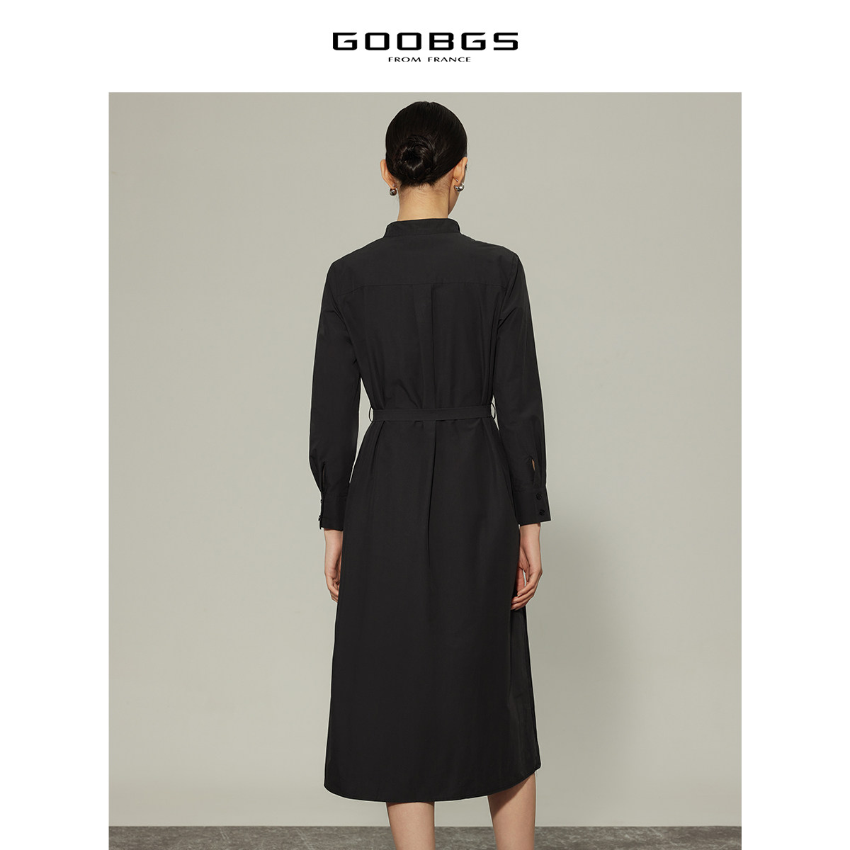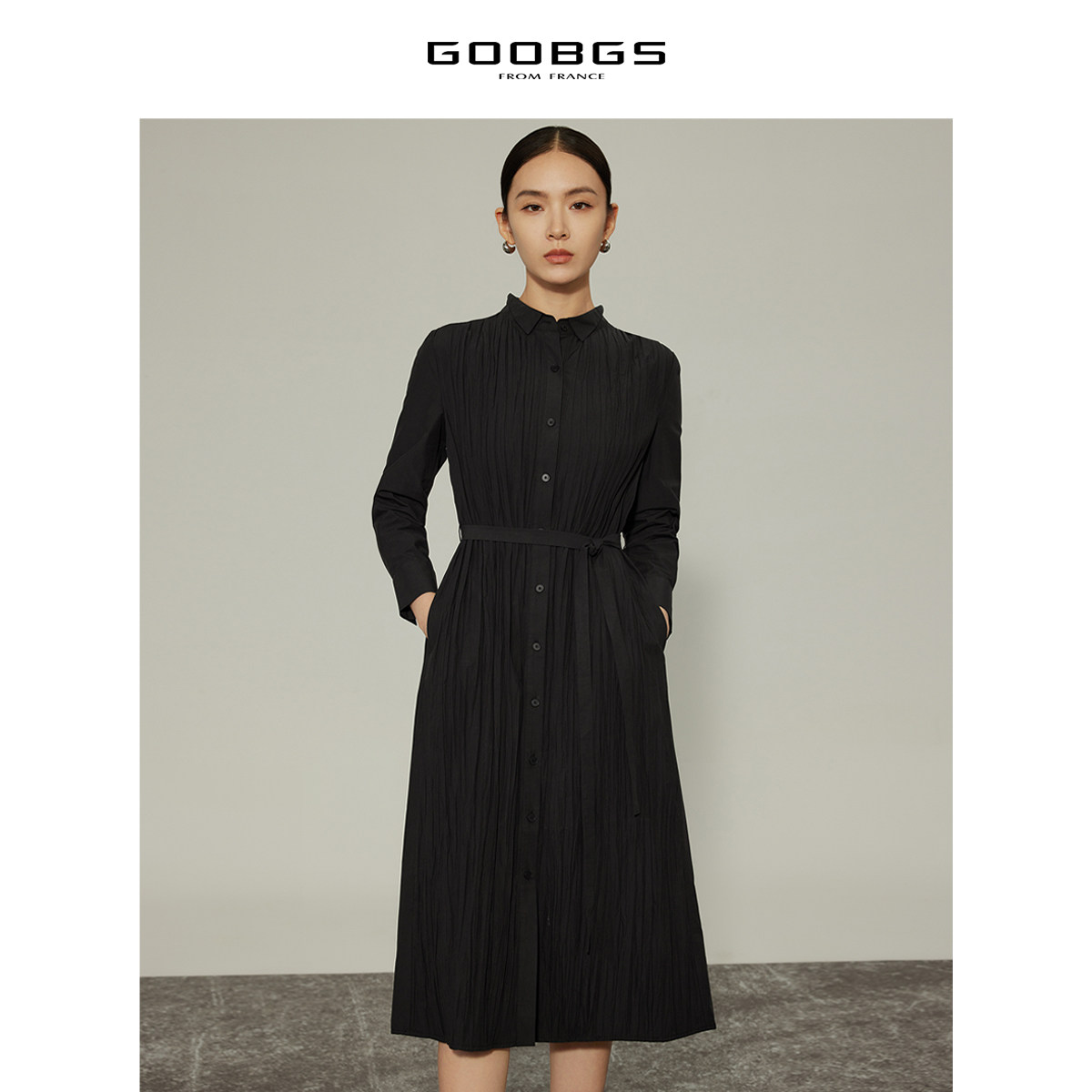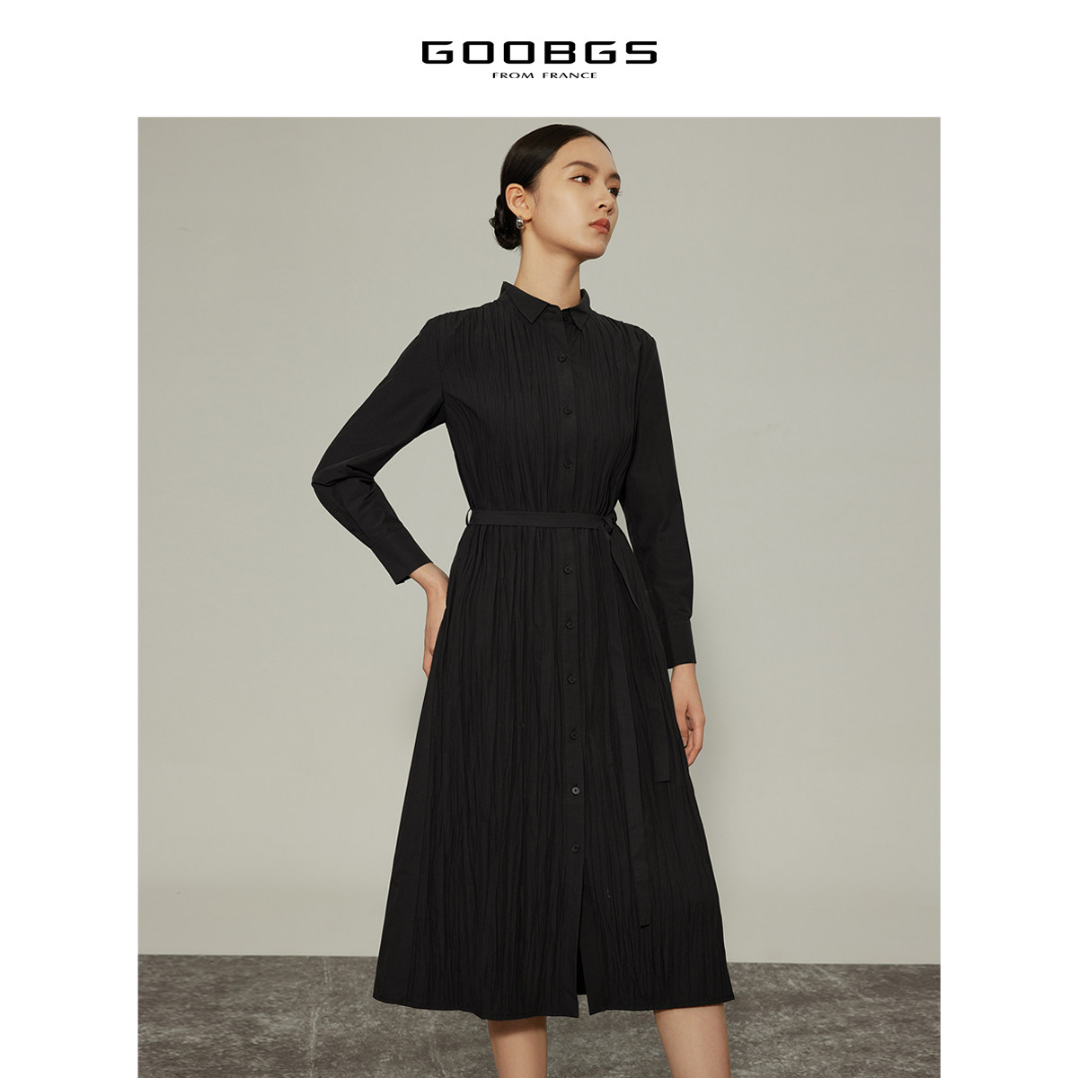 谷邦黑色小立领褶皱长袖连衣裙春秋新款高级感法式优雅通勤中长裙