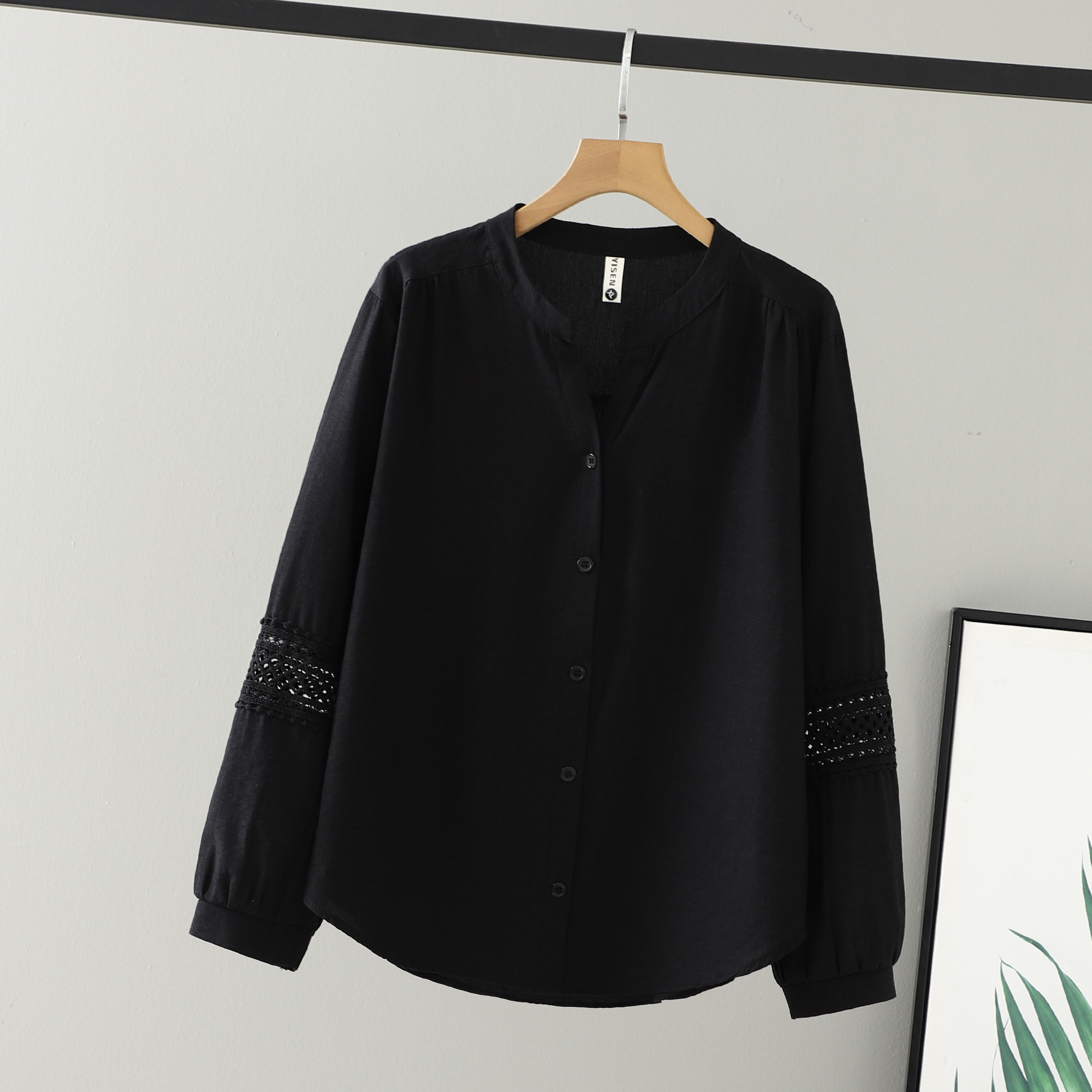 2026新款春装胖妹妹女装拼接V领蕾丝镂空女衬衫中年纯色大码衬衣