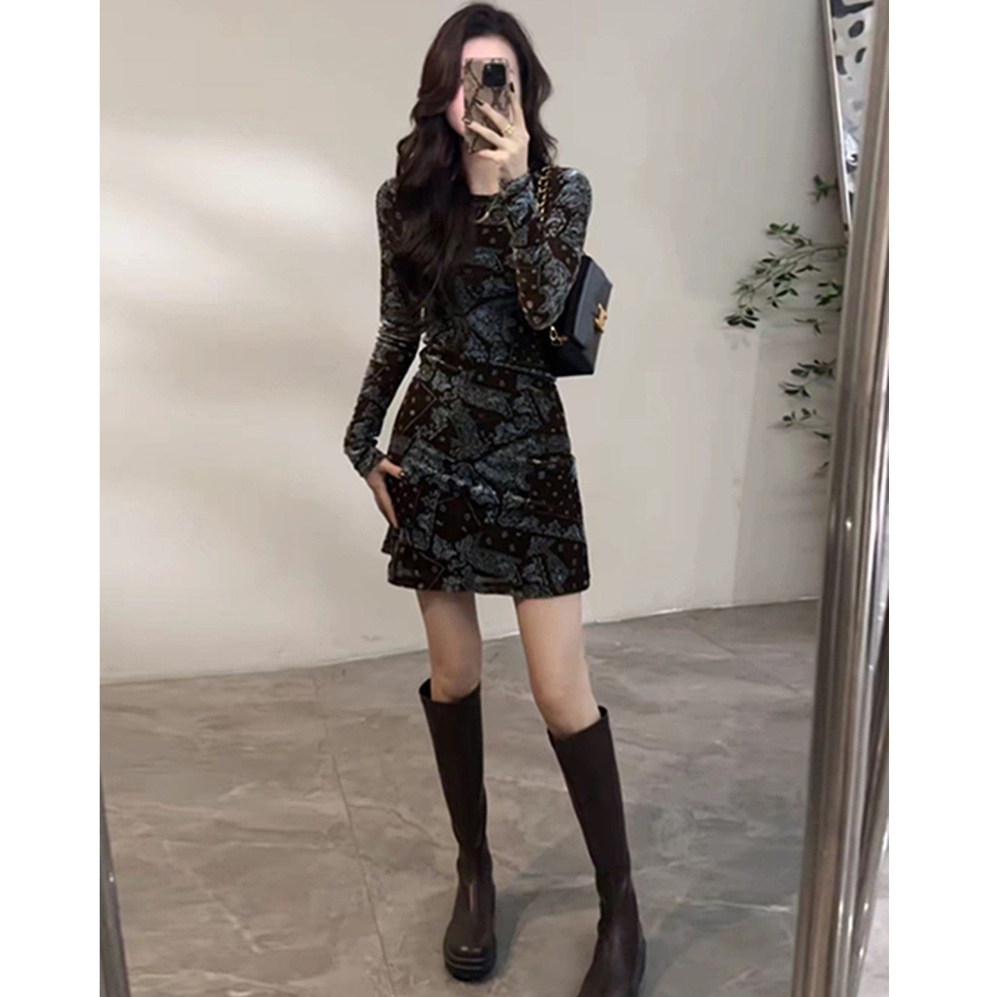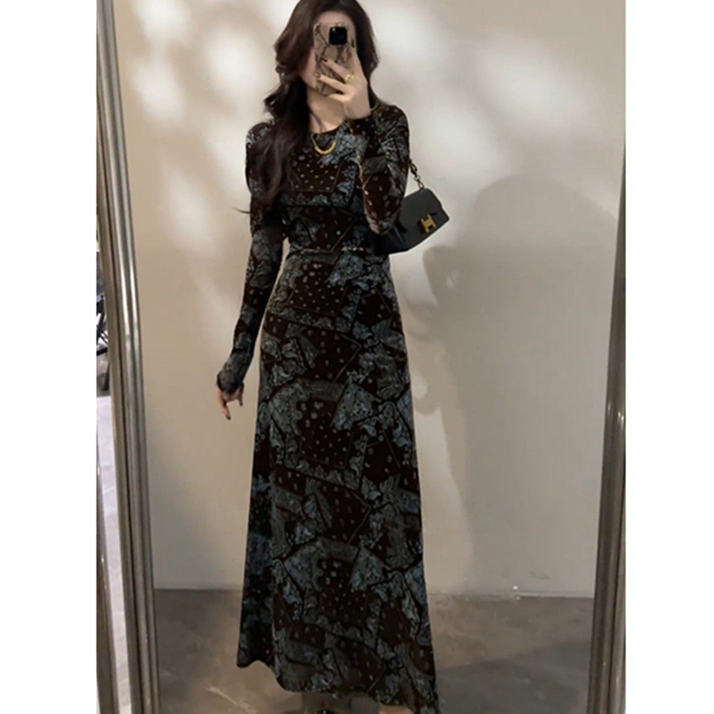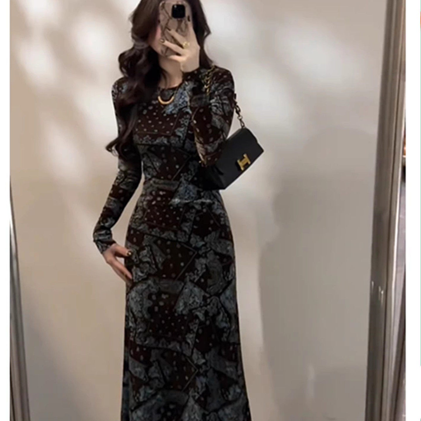 纯欲风复古印花加绒长袖连衣裙女秋冬优雅迷人修身显瘦A字长裙子