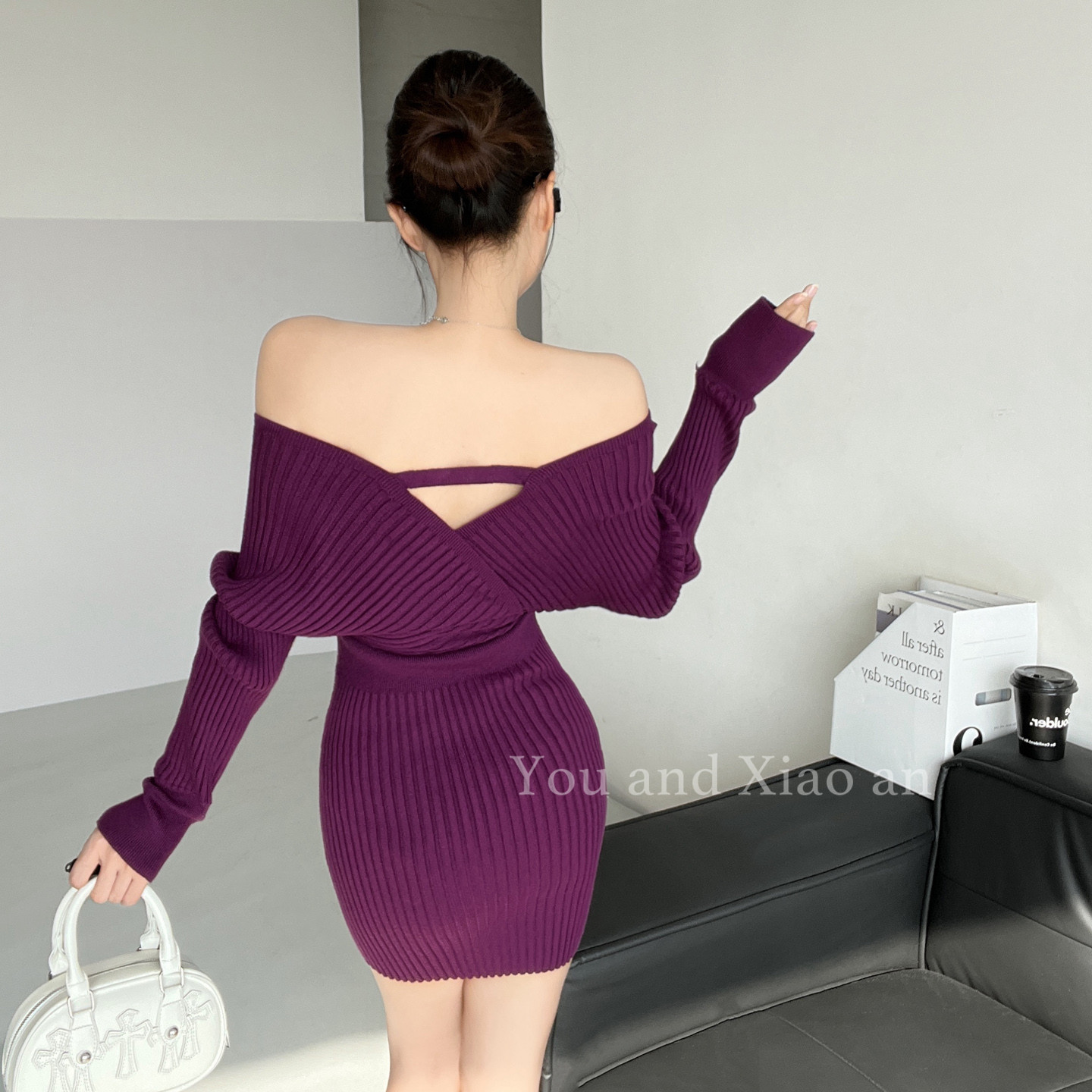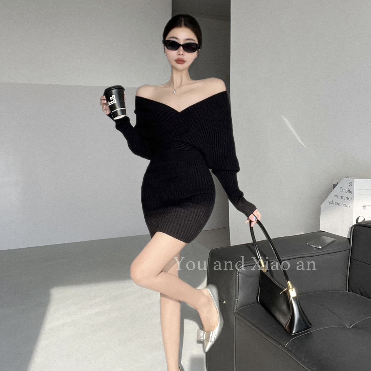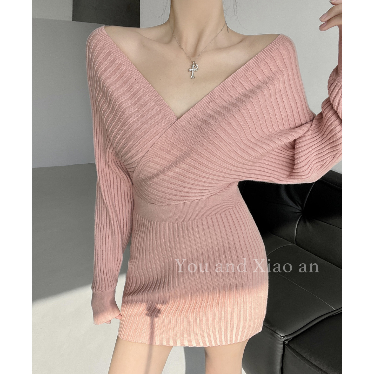 气场王~性感纯欲辣妹V领针织连衣裙女秋冬法式收腰短裙长袖包臀裙