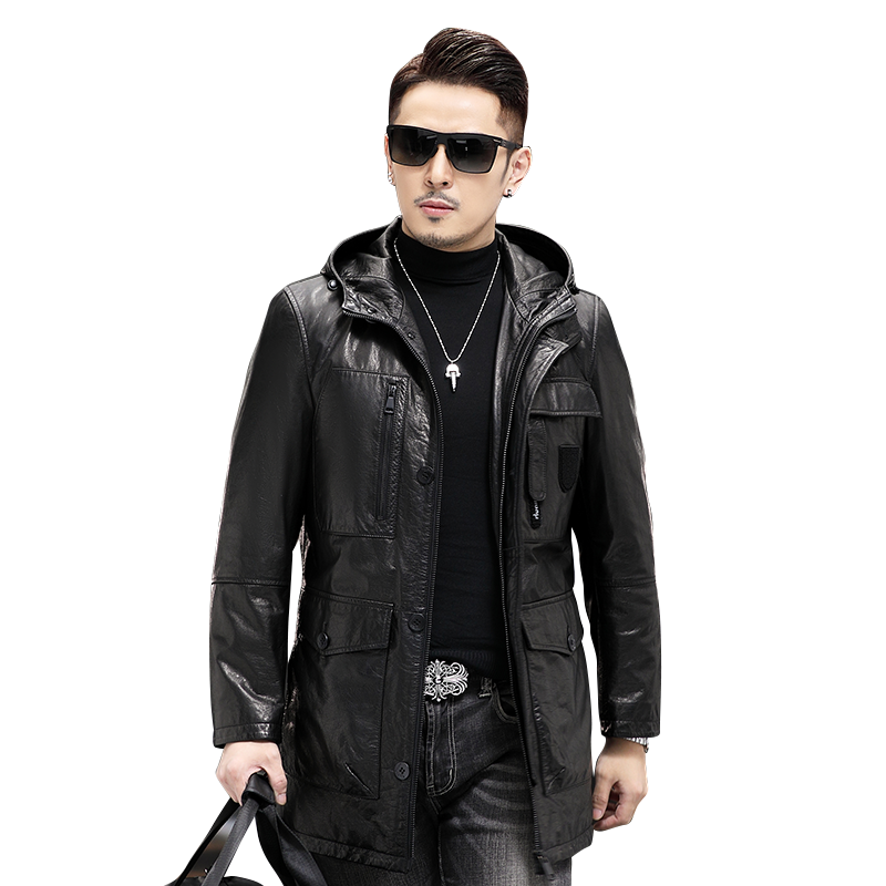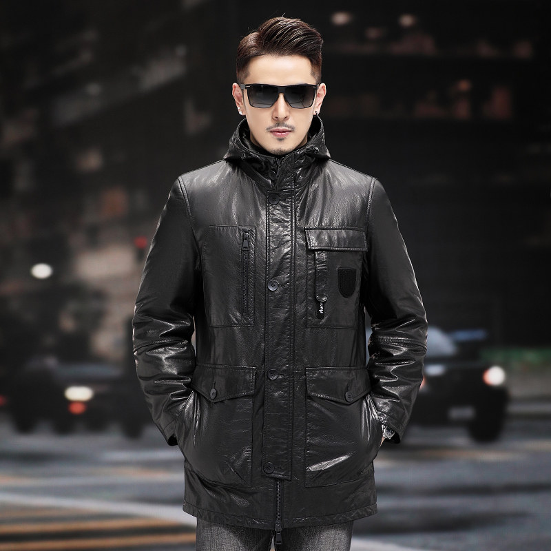 头层小牛皮外套男真皮皮衣连帽中长款可拆卸鹅绒内胆真皮夹克风衣