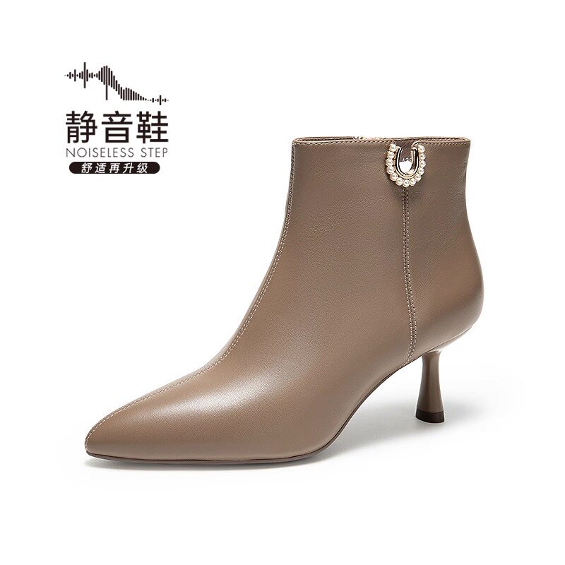 千百度2025静音靴细跟高跟尖头侧拉链羊皮女靴子A25588703A01A05
