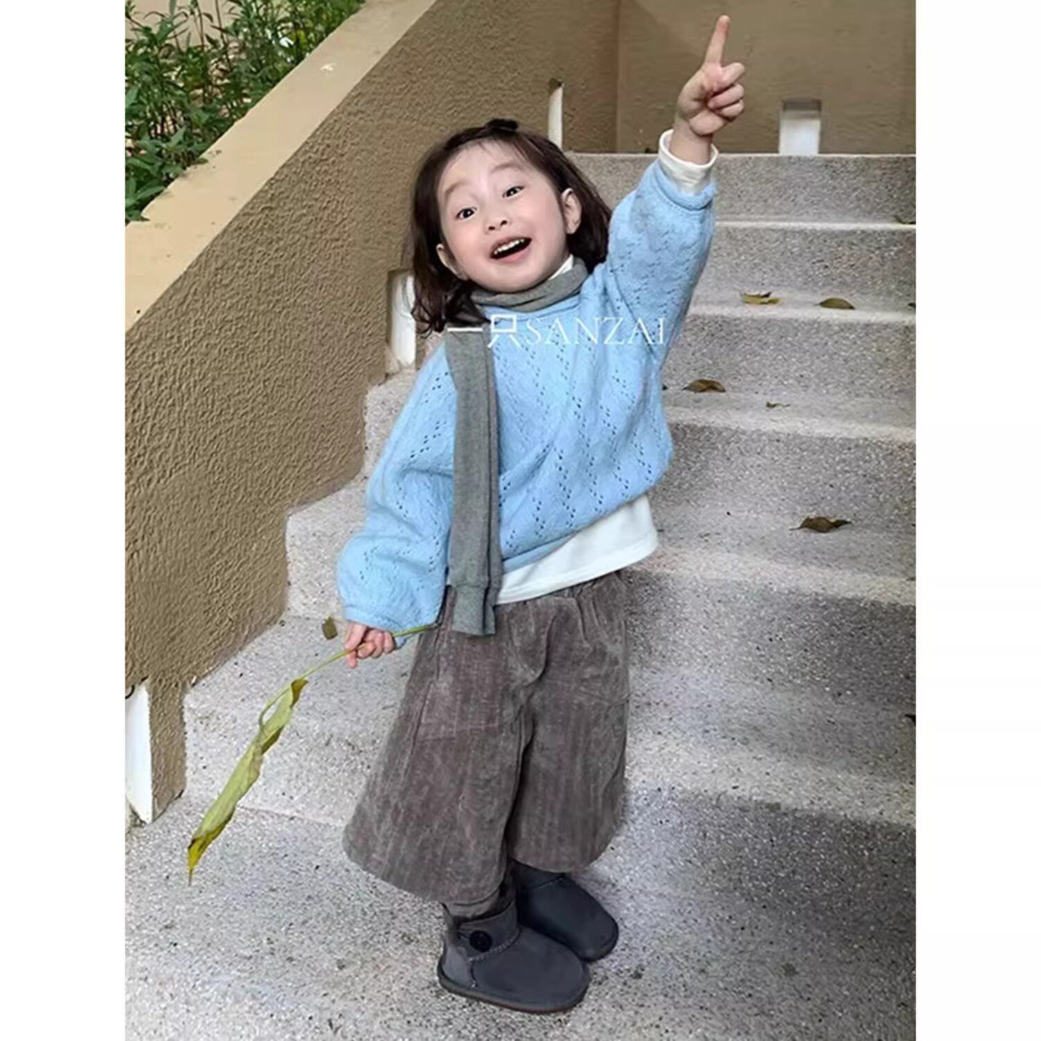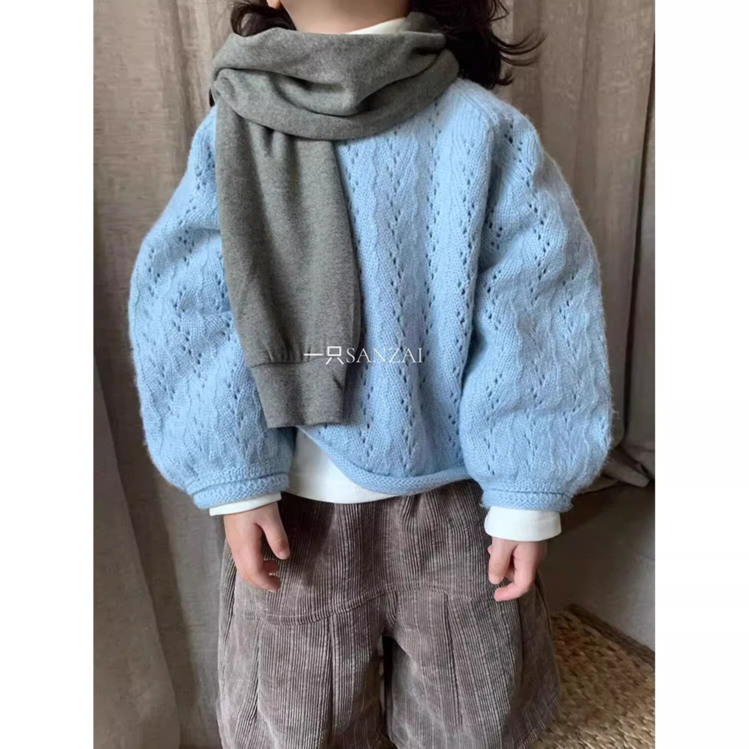 韩版女童2026春秋新款蓝色镂空宽松针织毛衣儿童时尚针织套头毛衣