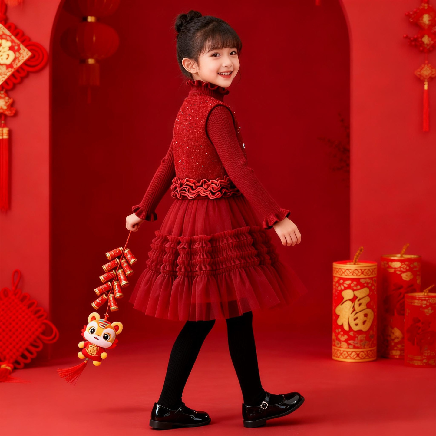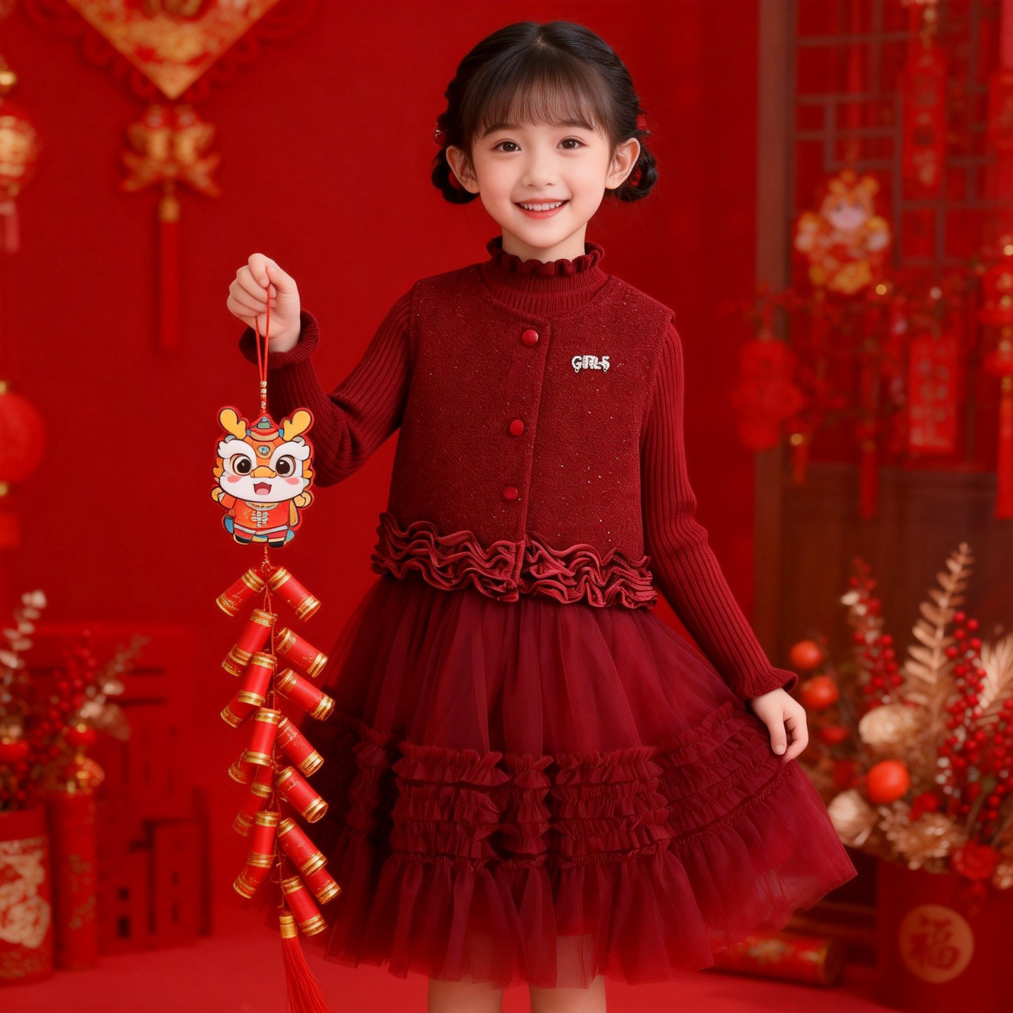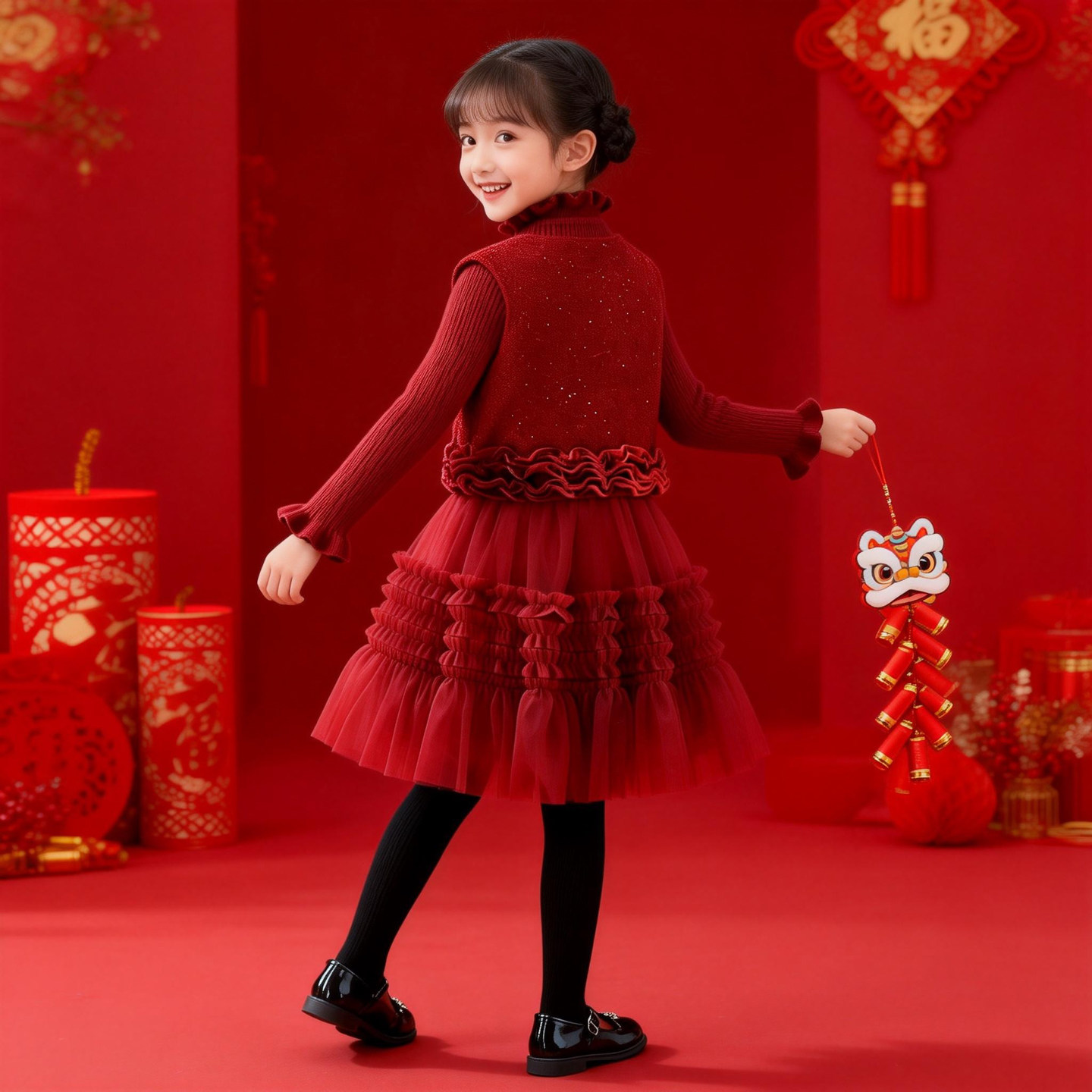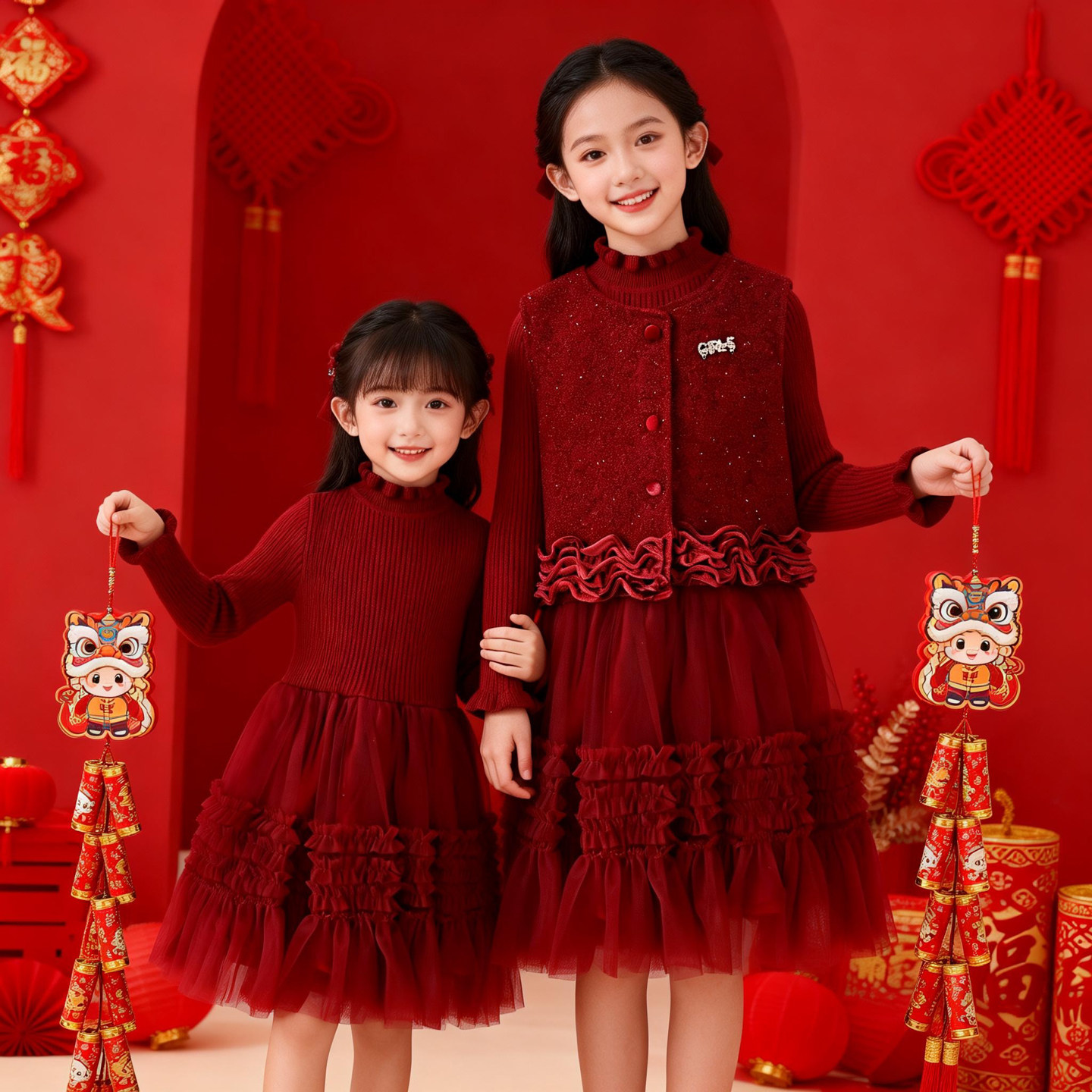女童小香风连衣裙小女孩冬季套装裙子红色蓬蓬裙中大童纱裙拜年服