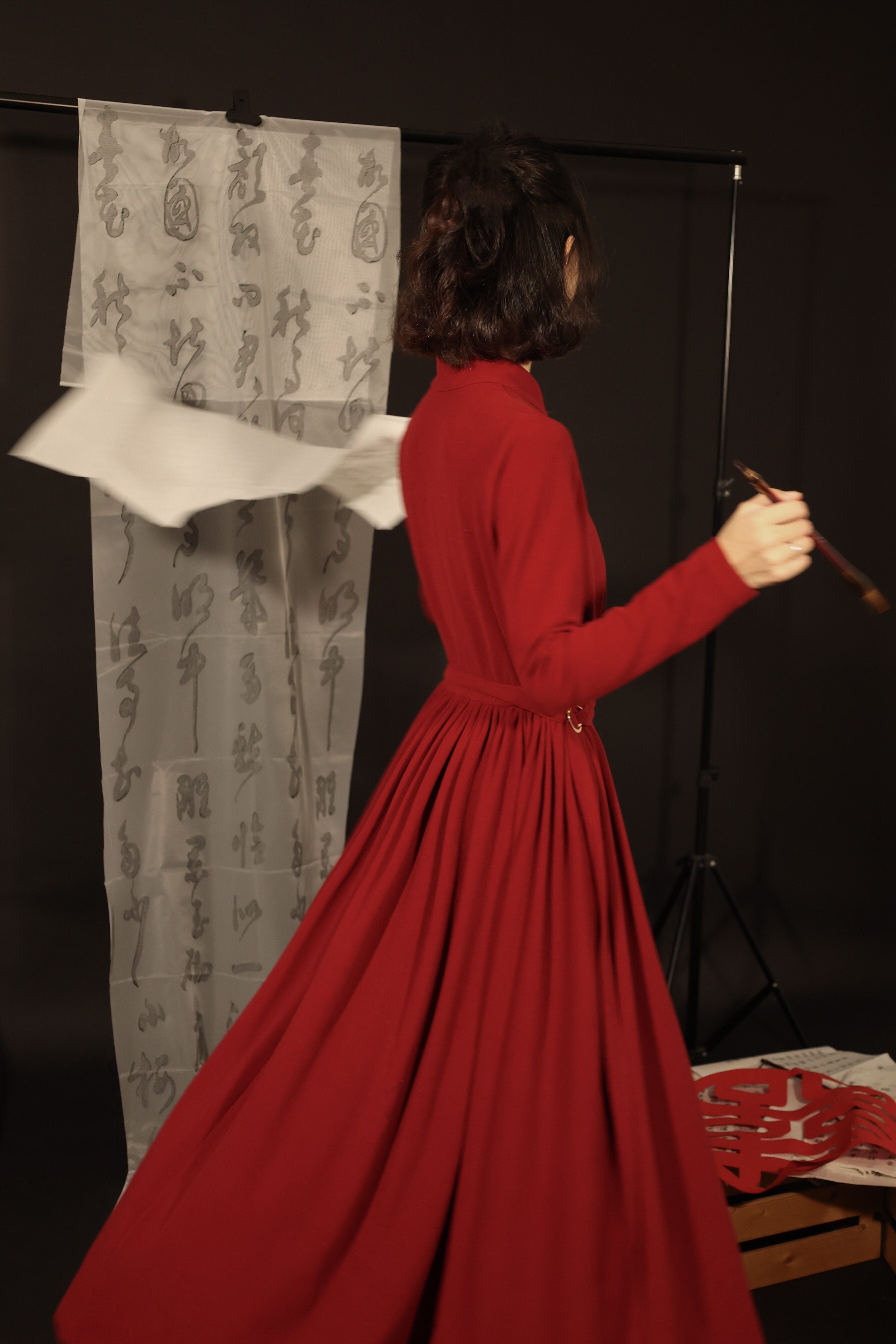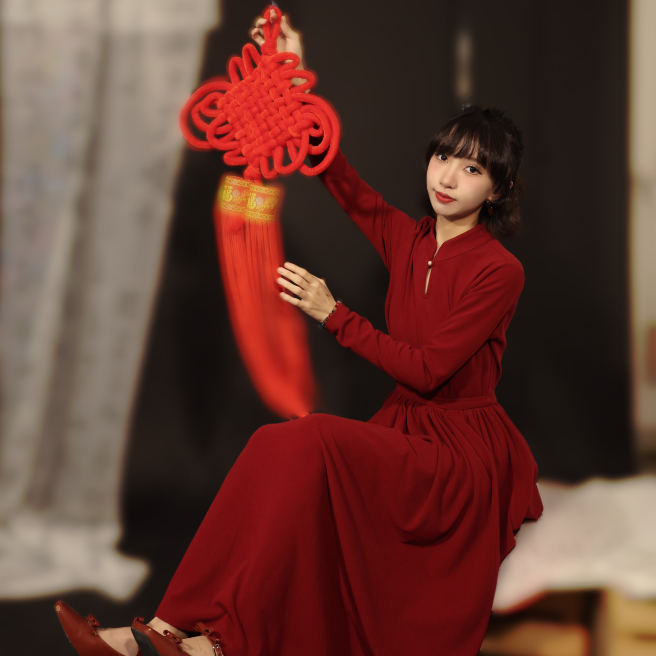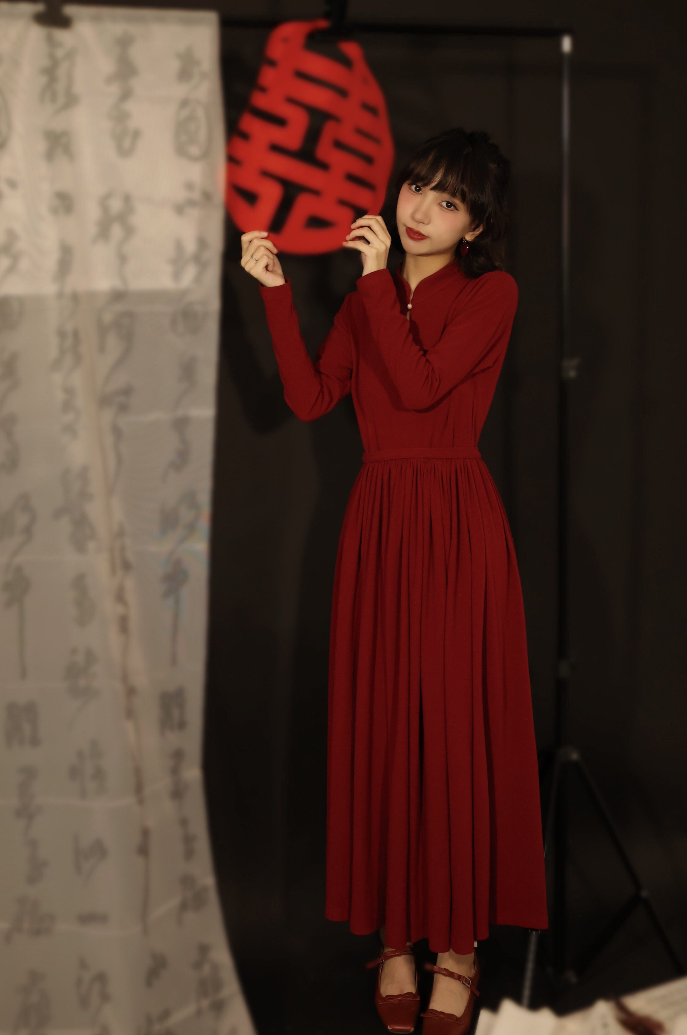 喵吉复古国风小个子长袖收腰内搭新年长款针织红色连衣裙长裙女秋