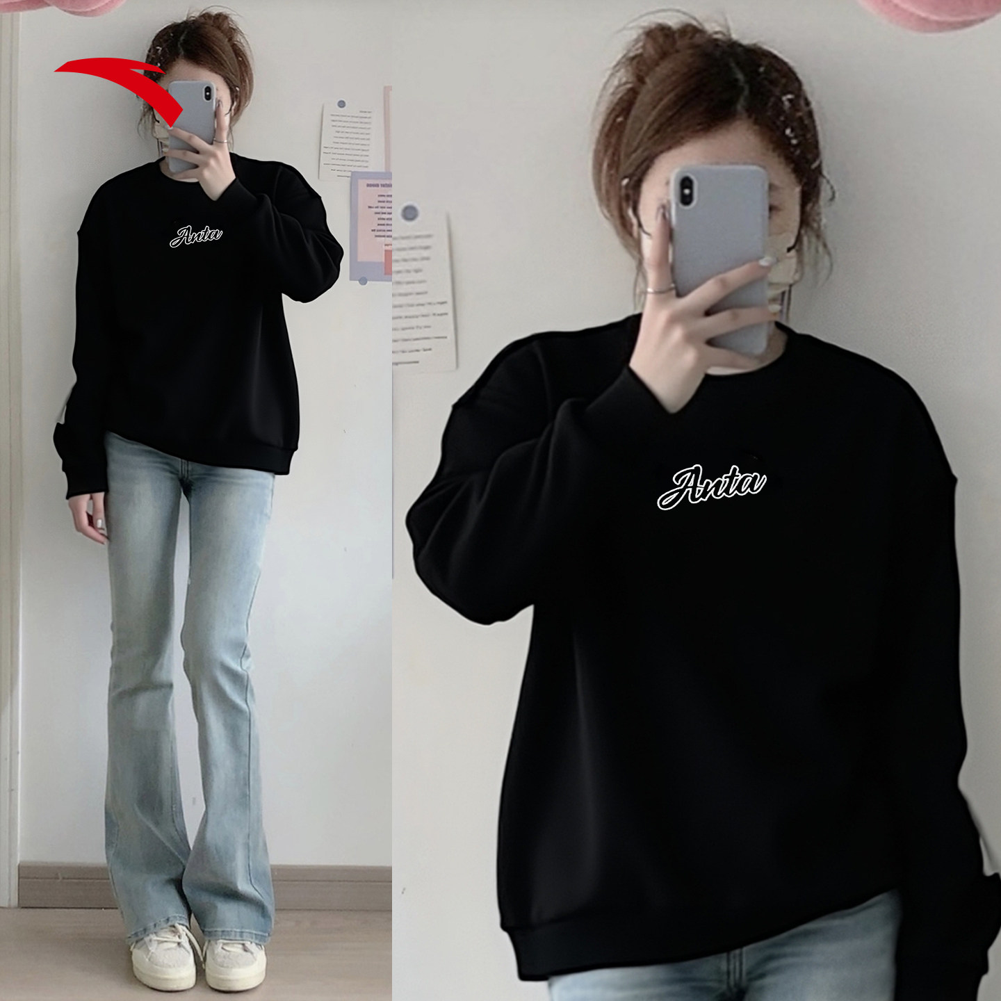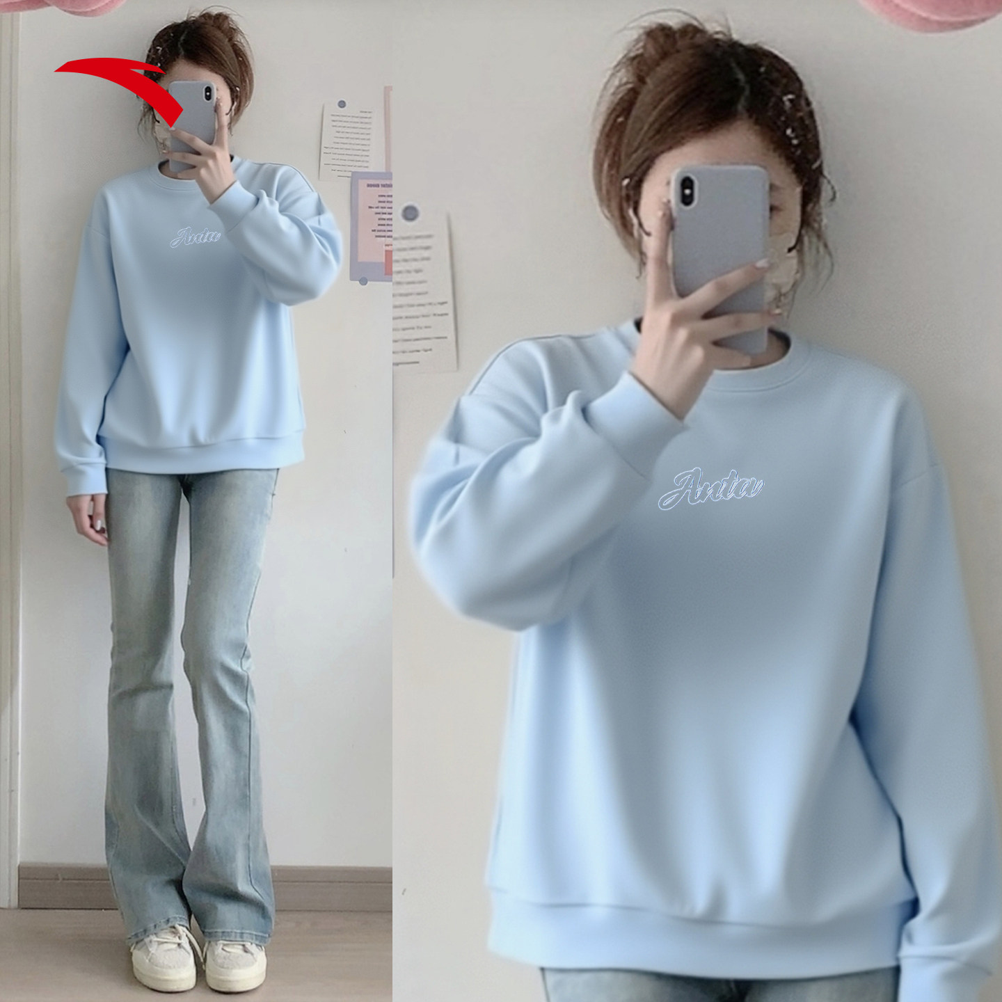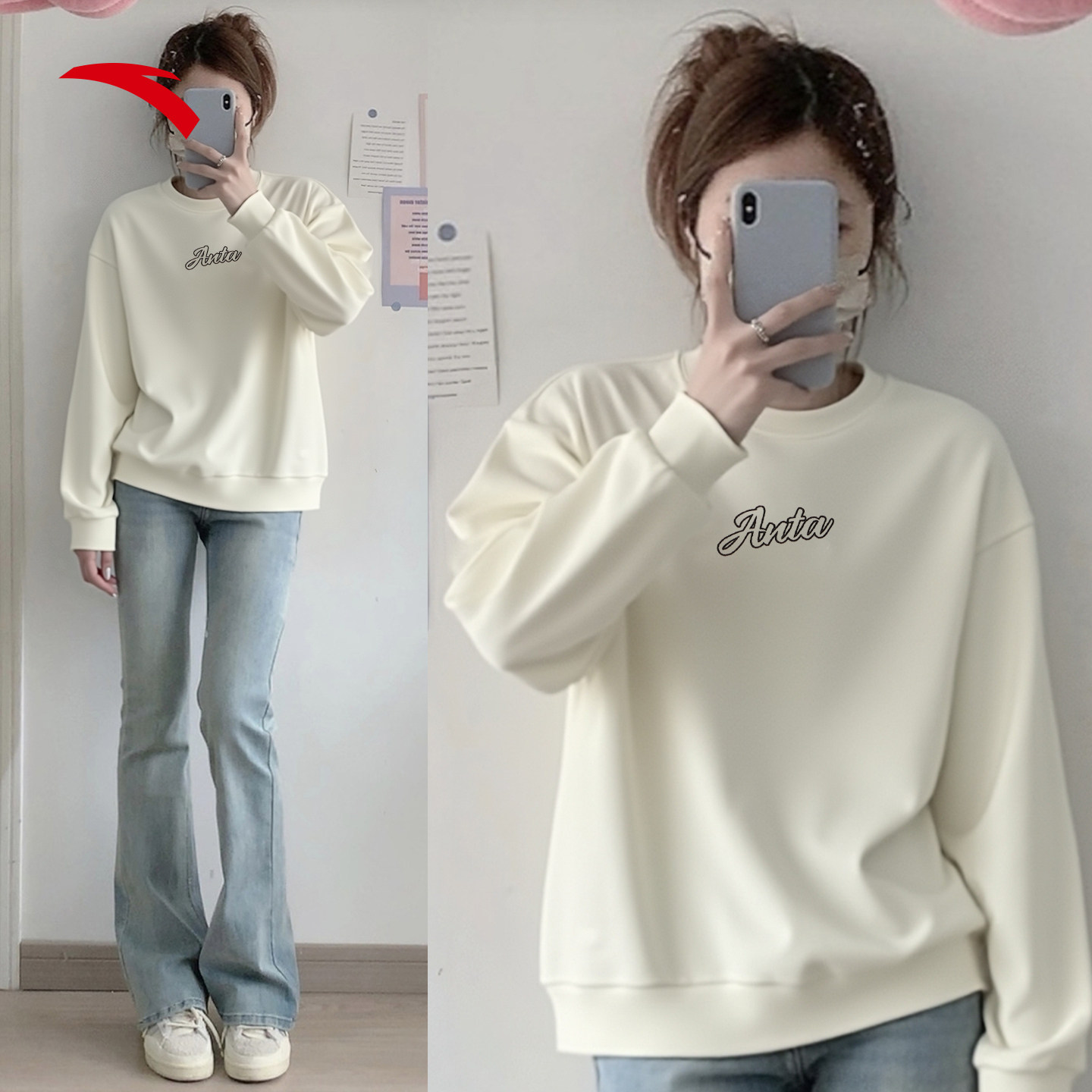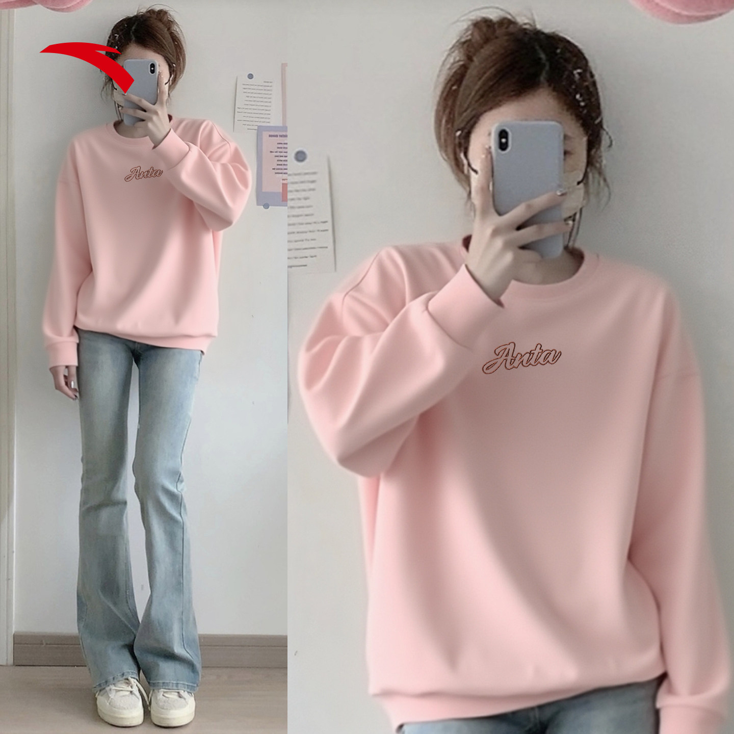 安踏圆领卫衣女显瘦2026新款小个子女装上衣无帽紫色正品宽松长袖
