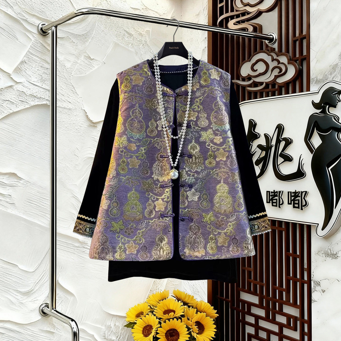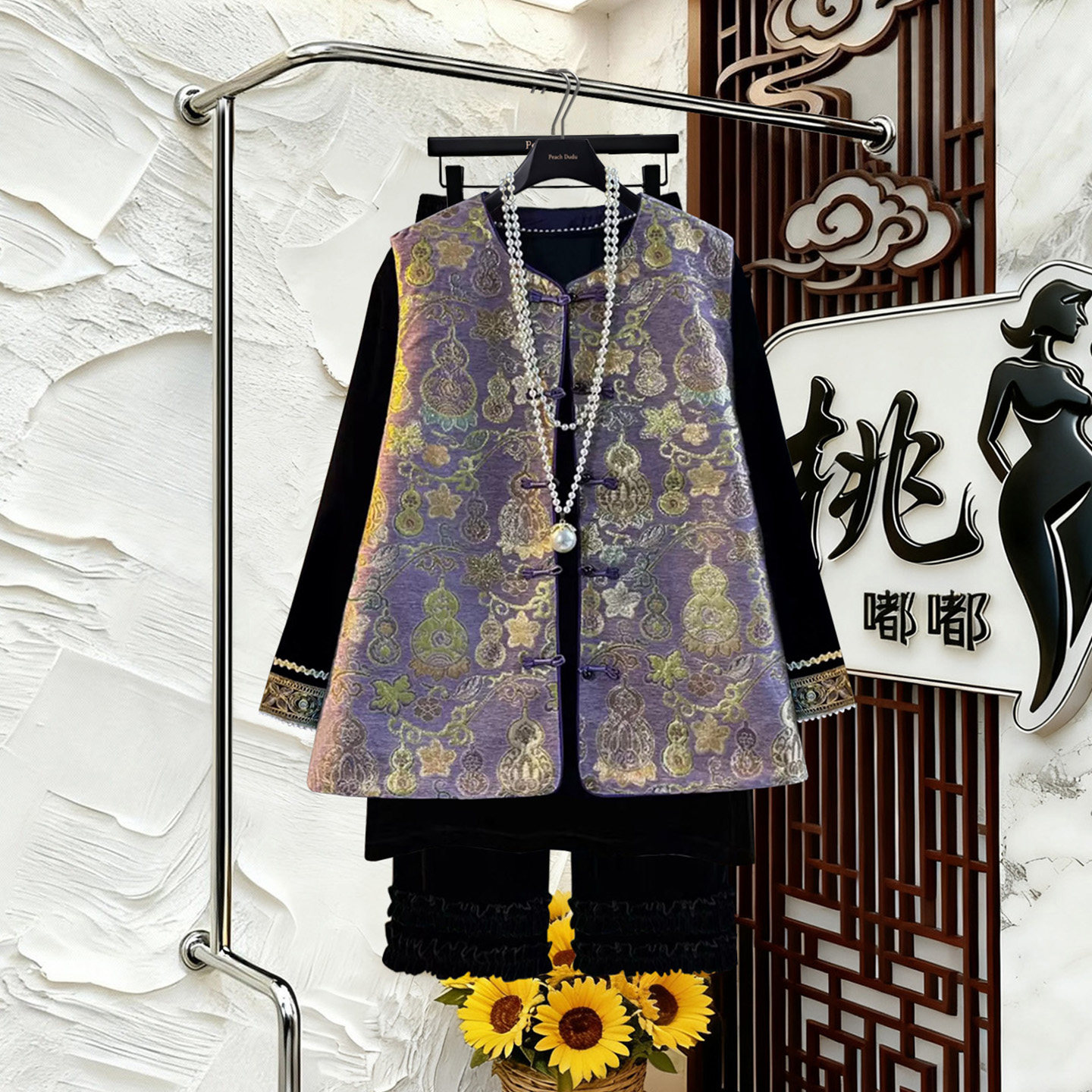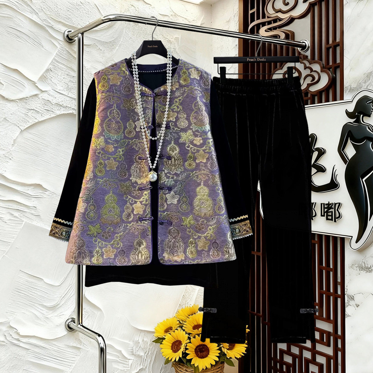 新中式国风特大码女装2026春季新款高级感丝绒马甲裤子胖mm三件套