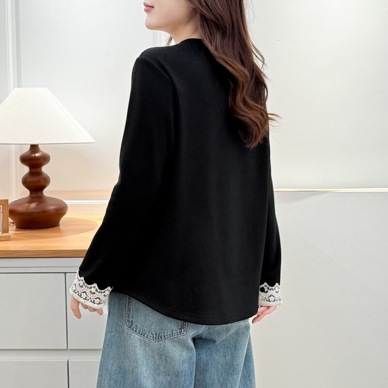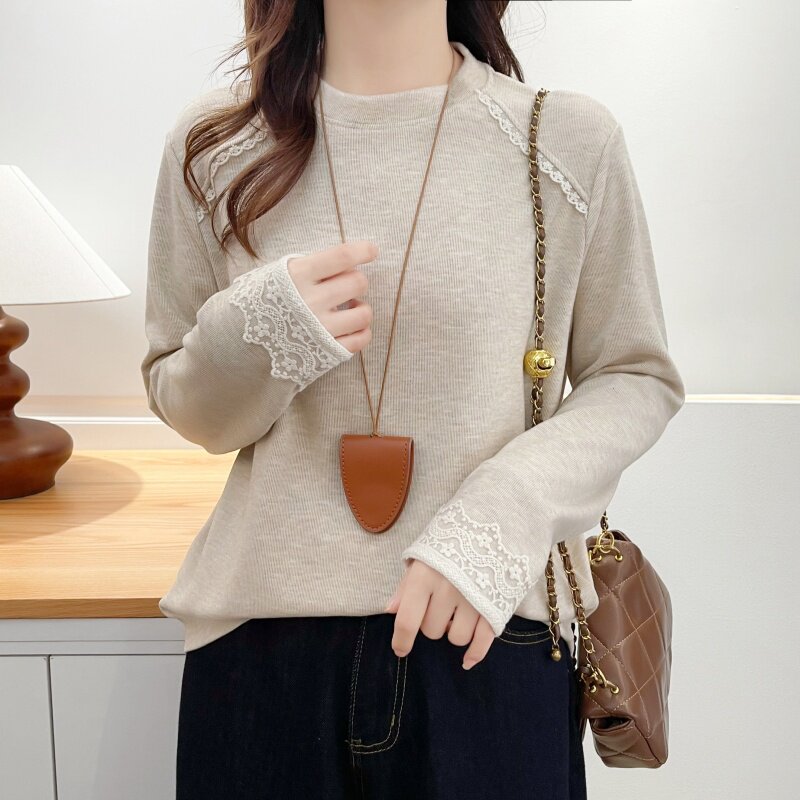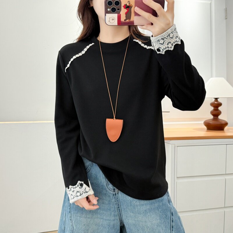 大码冬装新款蕾丝花边拼接长袖T恤女装圆领显瘦内搭加绒打底衫