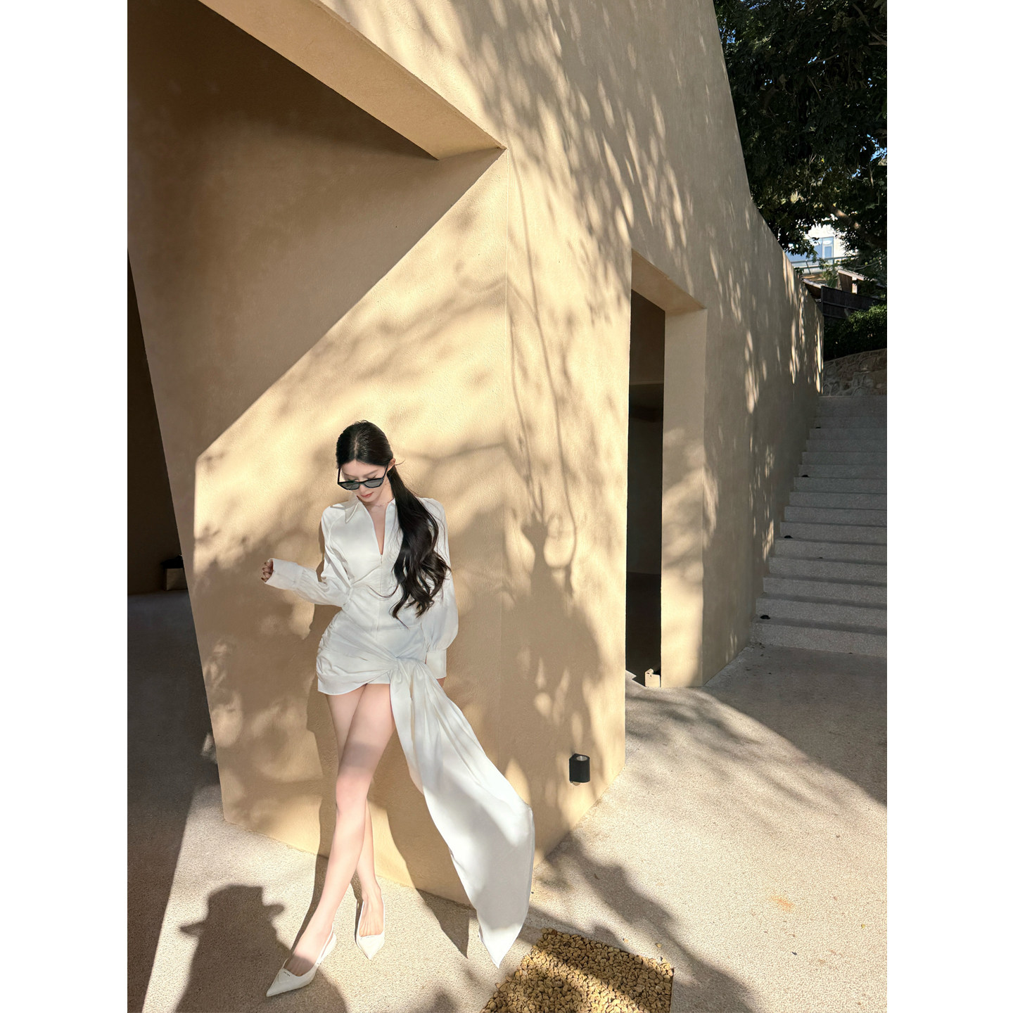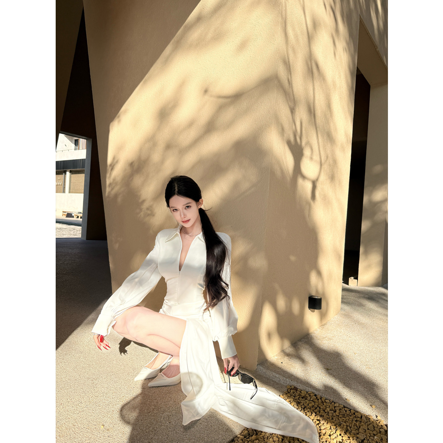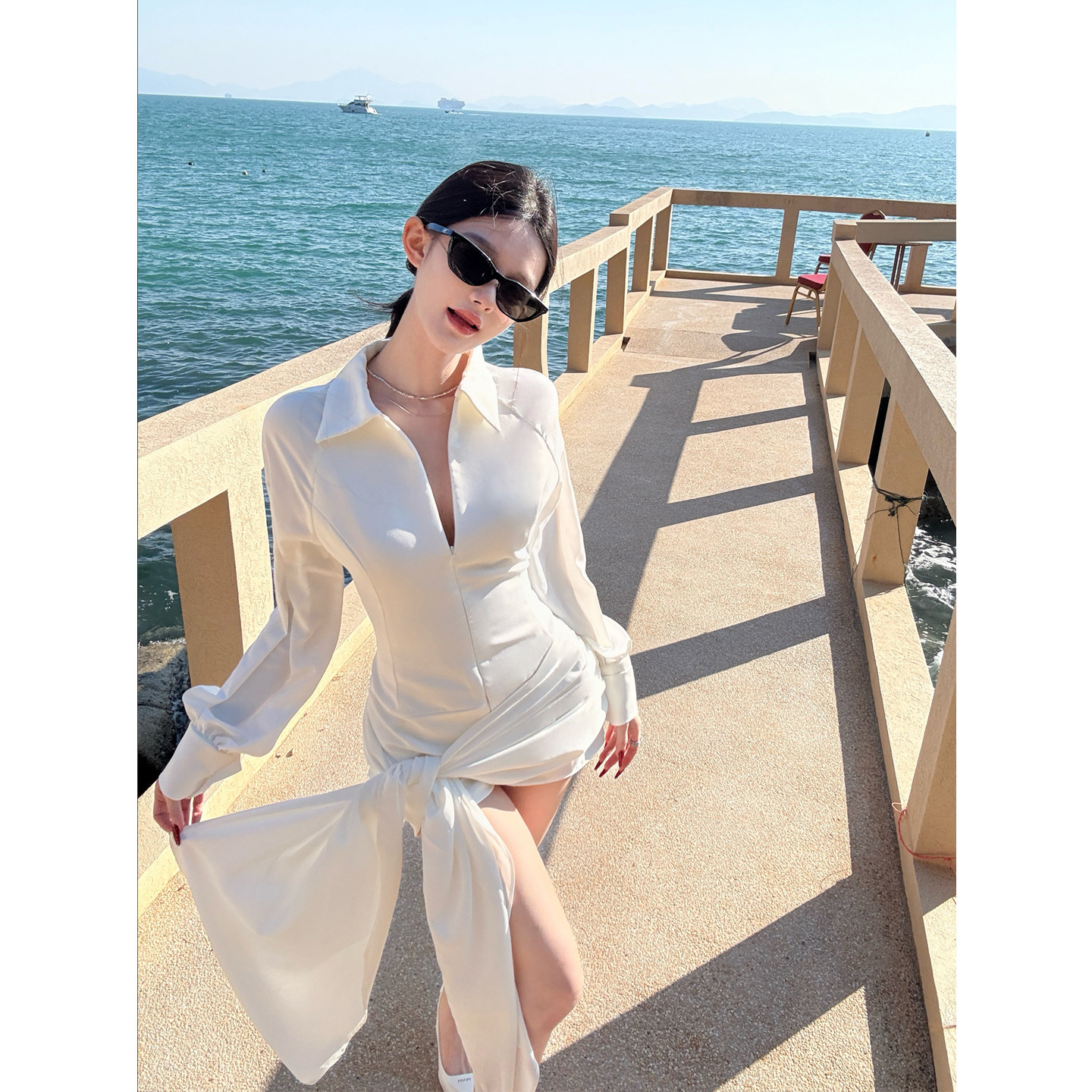 Czelora纯子斩男约会裙白色缎面长袖连衣裙收腰绑带包臀裙辣妹风