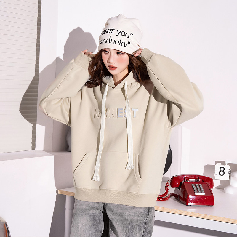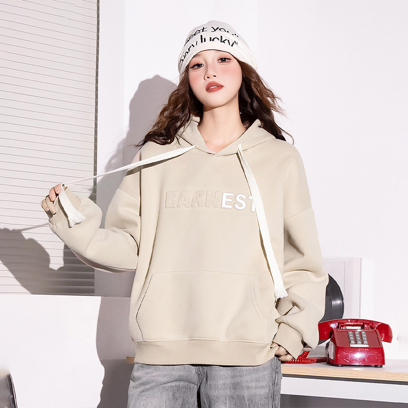热风女士时尚钢印质感百搭连帽女款卫衣秋冬加绒字母印花休闲上衣