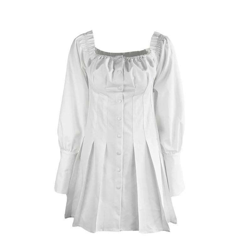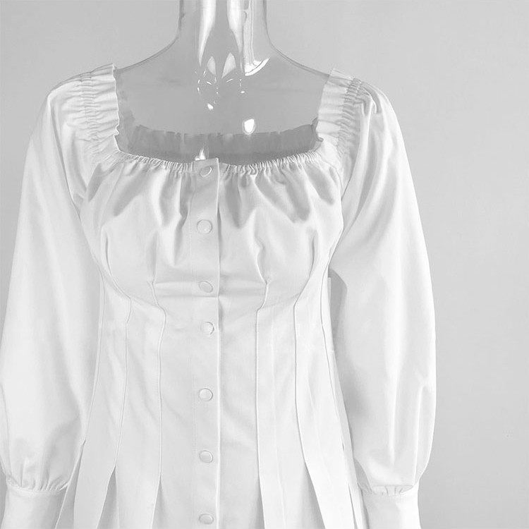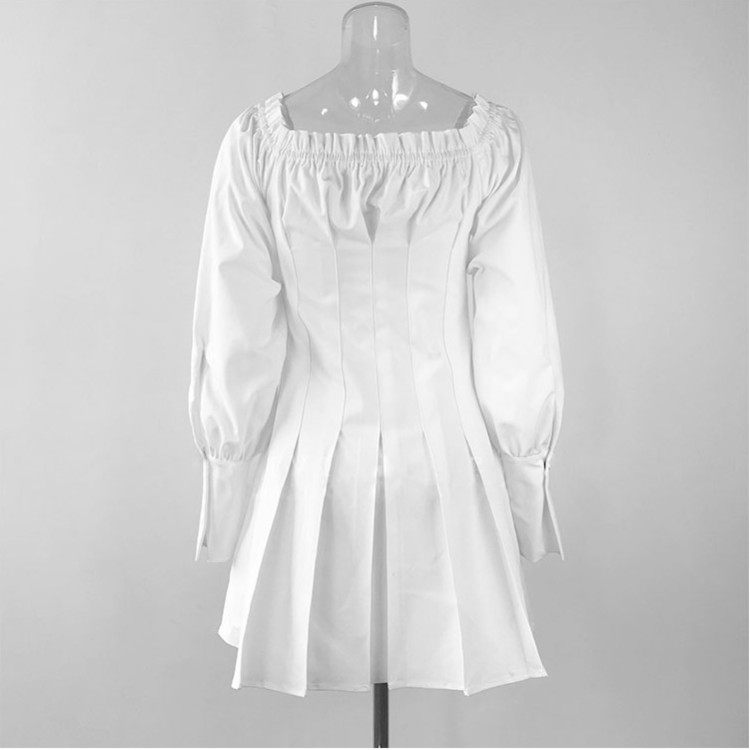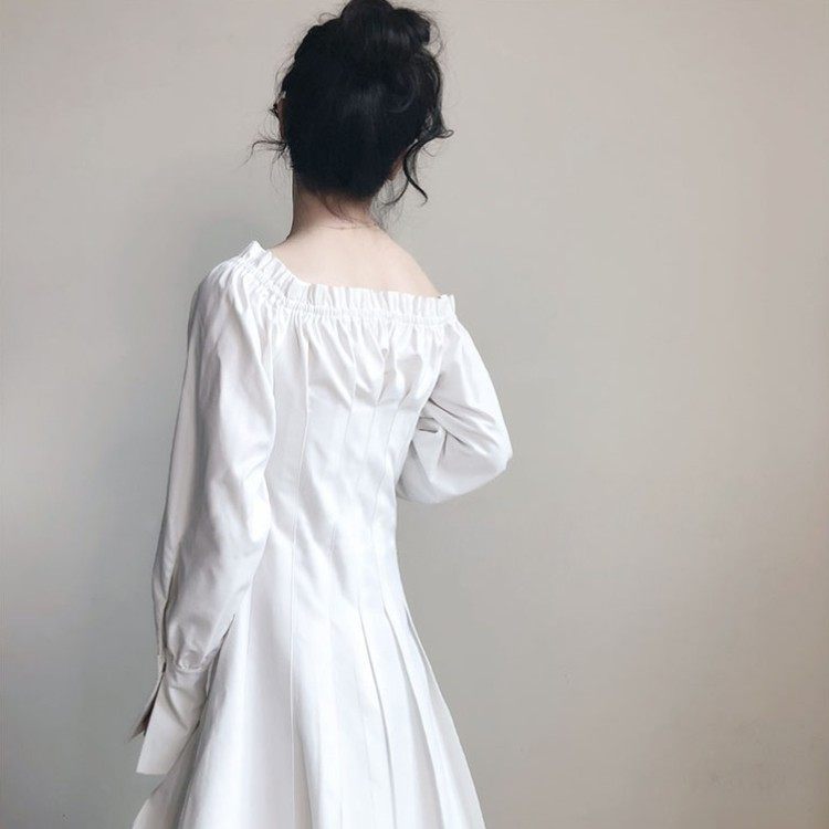 高端定制网红爆款秋季性感露肩一字领高腰单排扣长袖白色连衣裙女