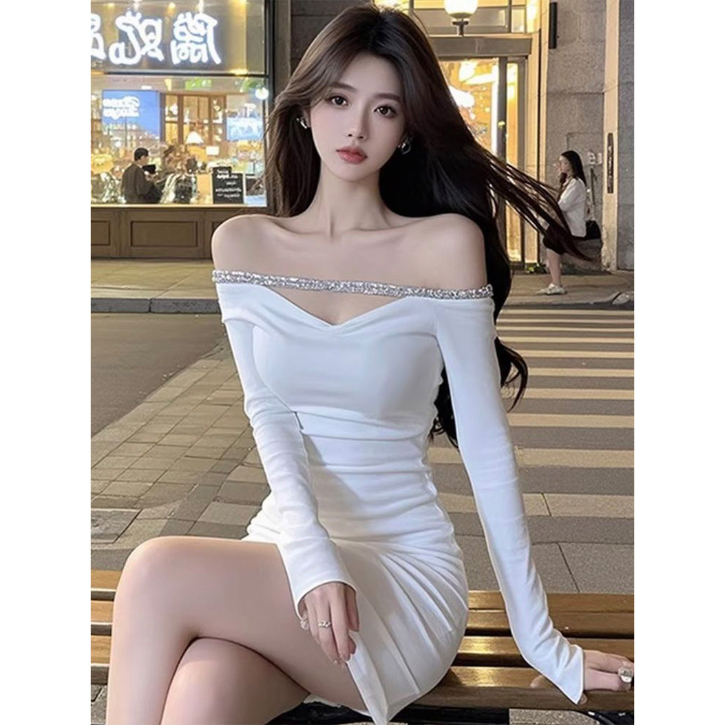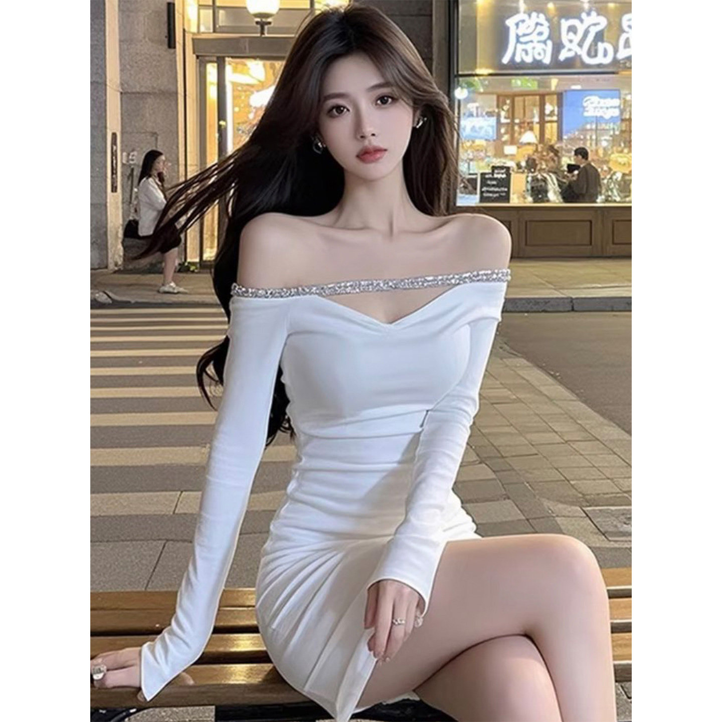 性感露肩白色V领长袖连衣裙气质辣妹风纯欲修身显瘦短款包臀裙子