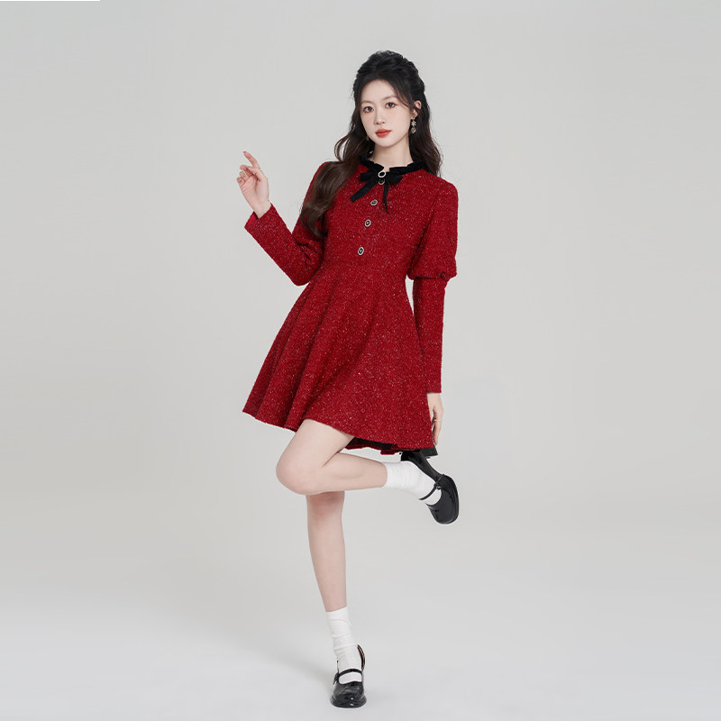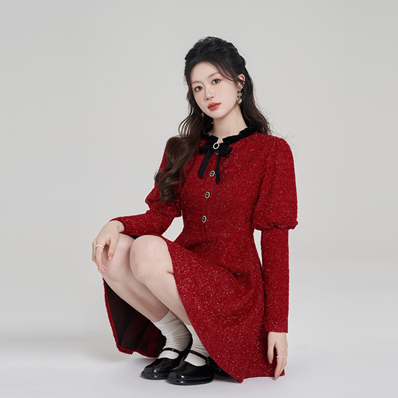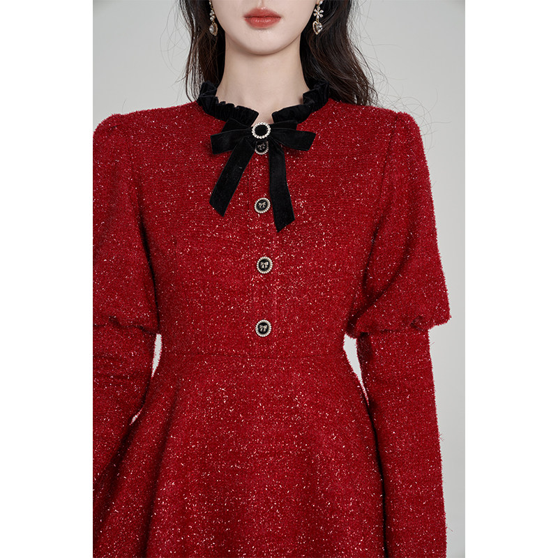 311线报网描述:法式红色亮丝长袖连衣裙女冬季