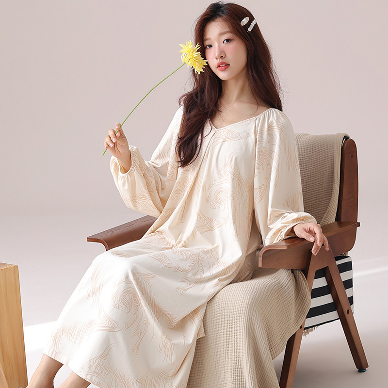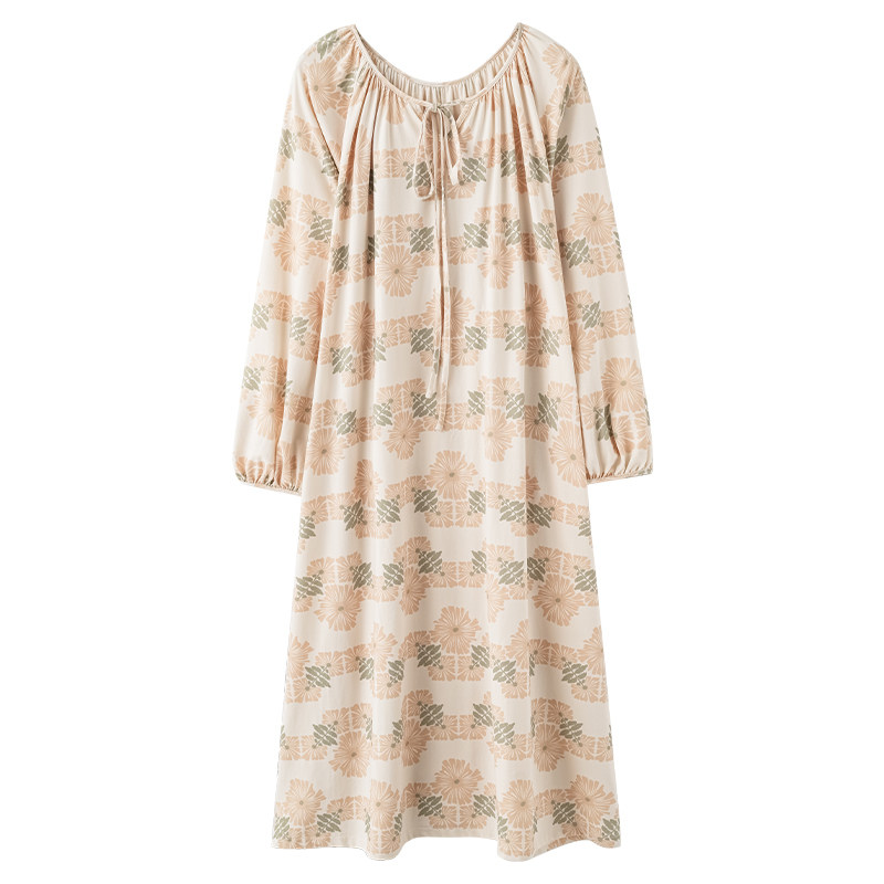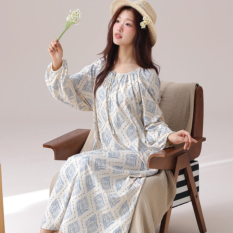 女士春秋季睡裙2026新款长袖田园风中长款纯棉睡衣连衣裙可外穿