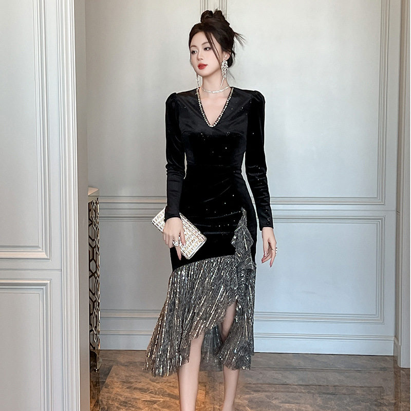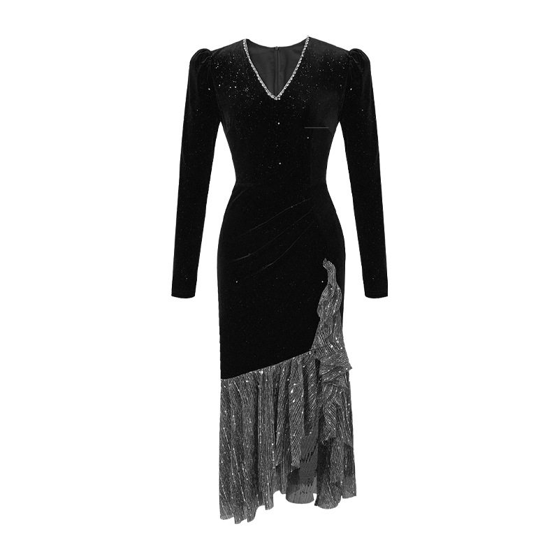 年会礼服裙2025秋冬装新款女装法式V领修身显瘦不规则连衣裙21528