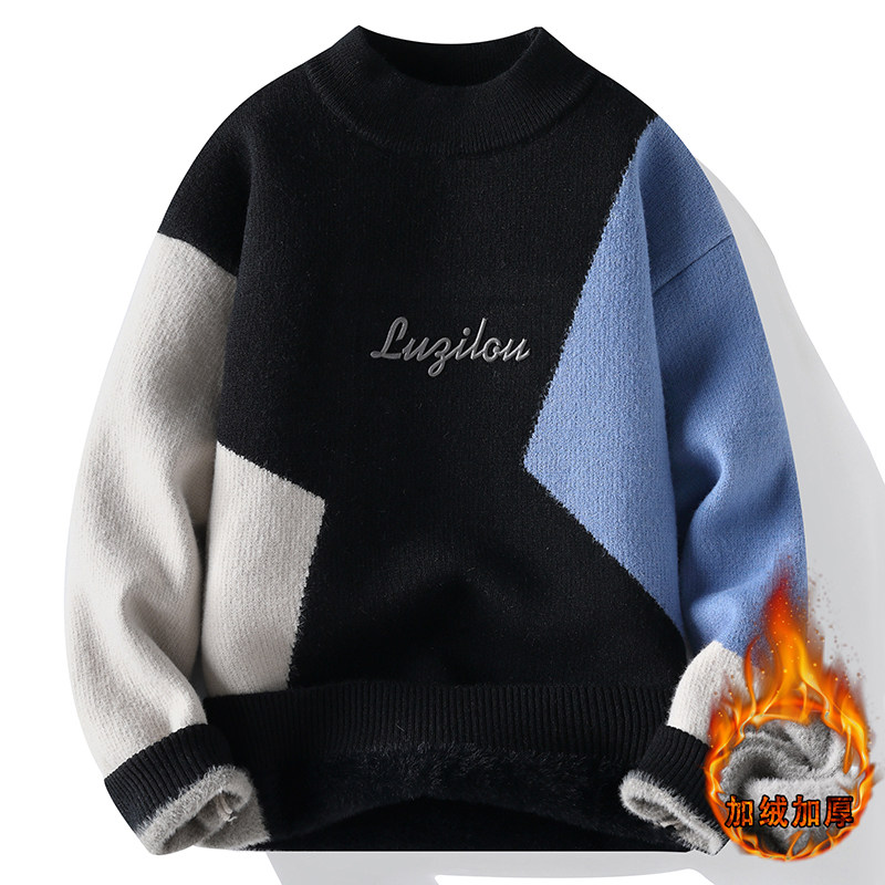一体绒加绒加厚毛衣男秋冬季潮牌青少年初中高中学生半高领针织衫