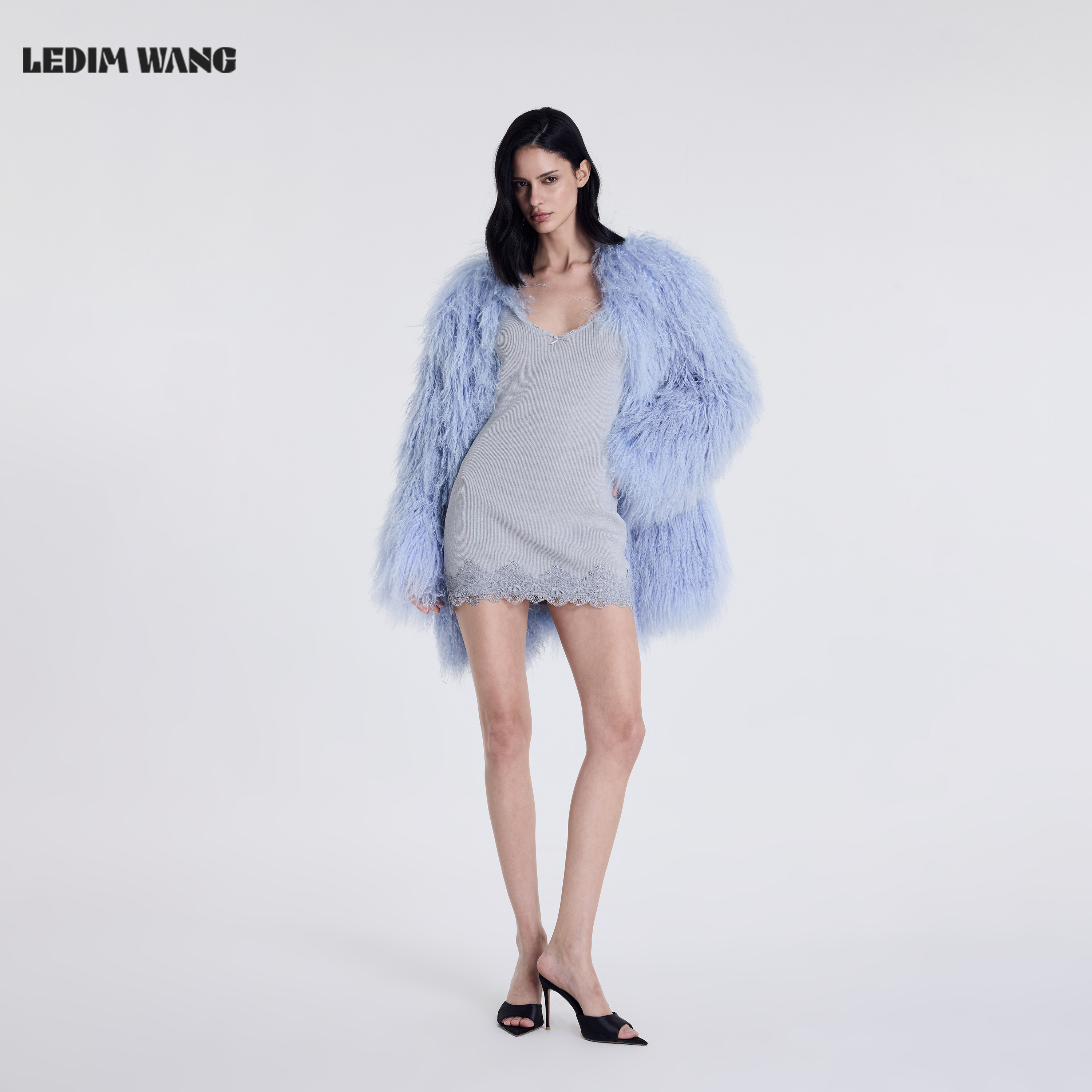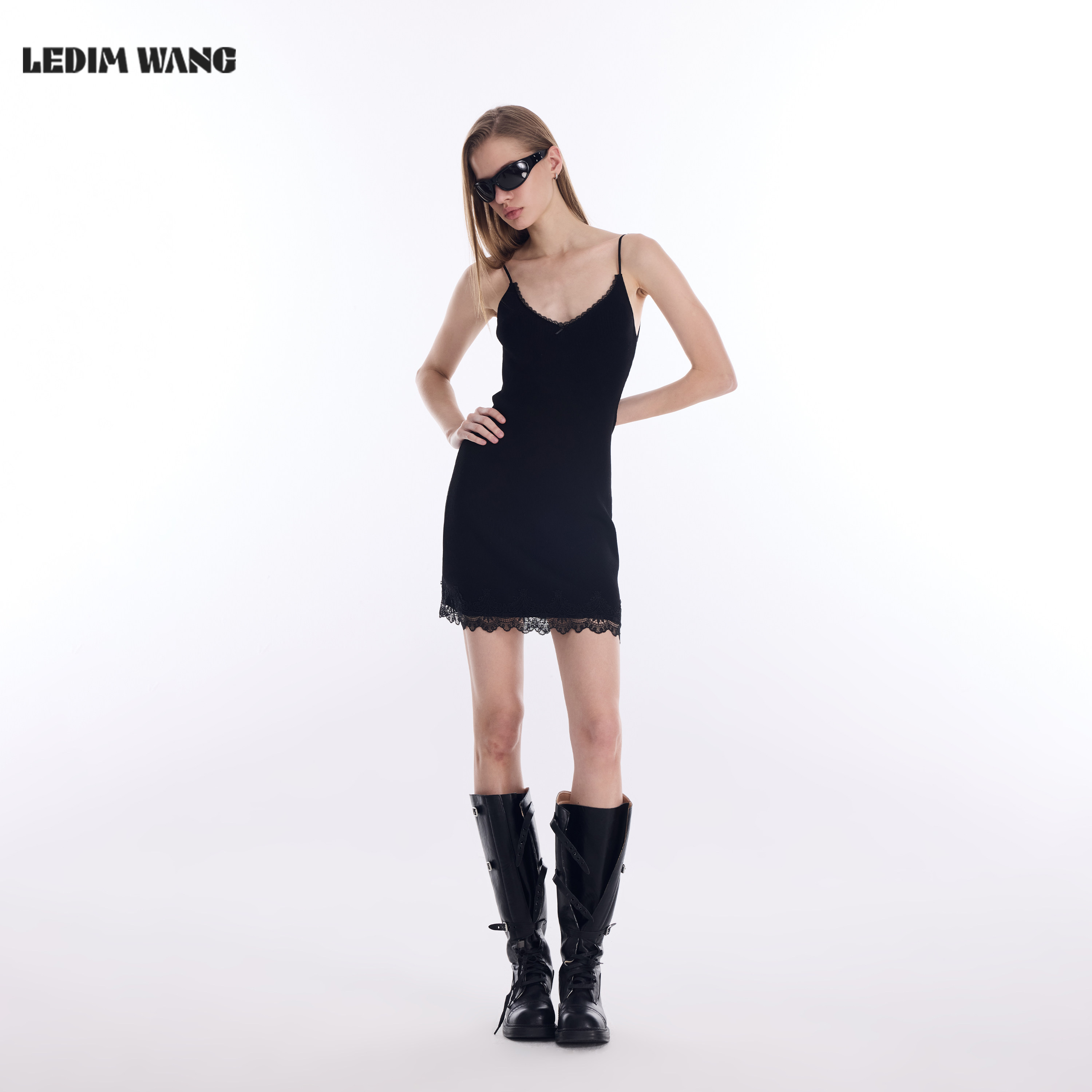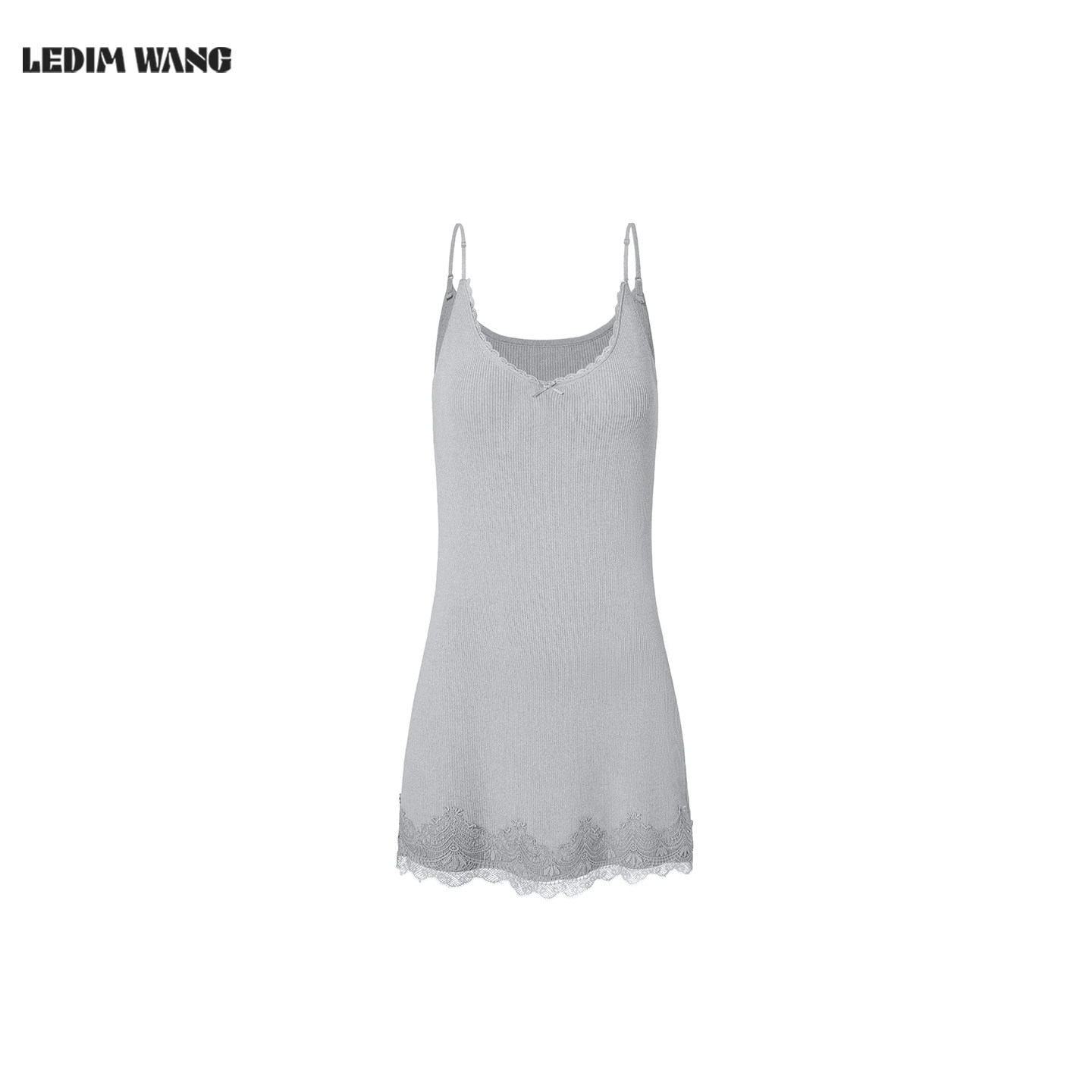 LEDIM WANG蕾丝针织吊带连衣裙女2026春新款灰色轻奢修身薄款短裙