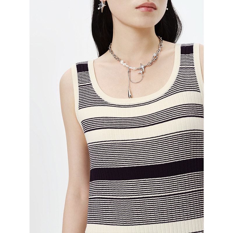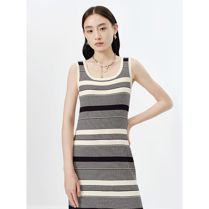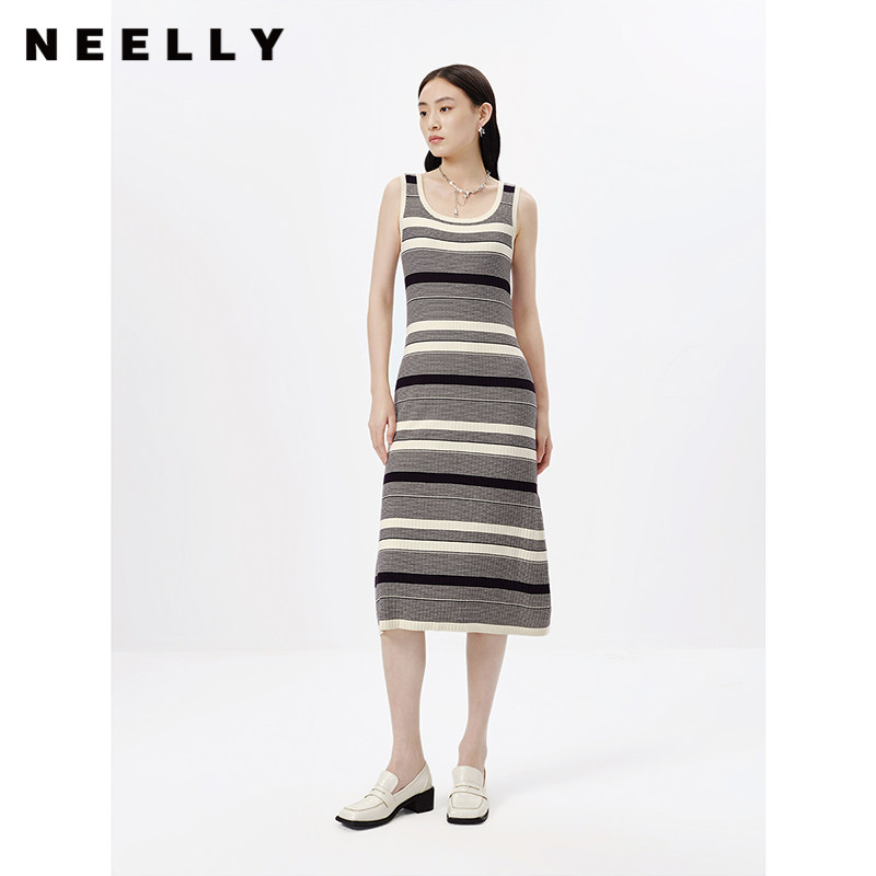 NEELLY纳俪商场同款春无袖条纹连衣裙女中长款套头吊带裙修身百搭