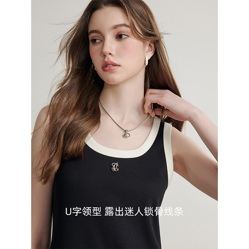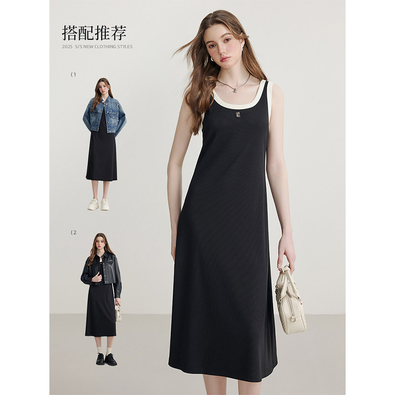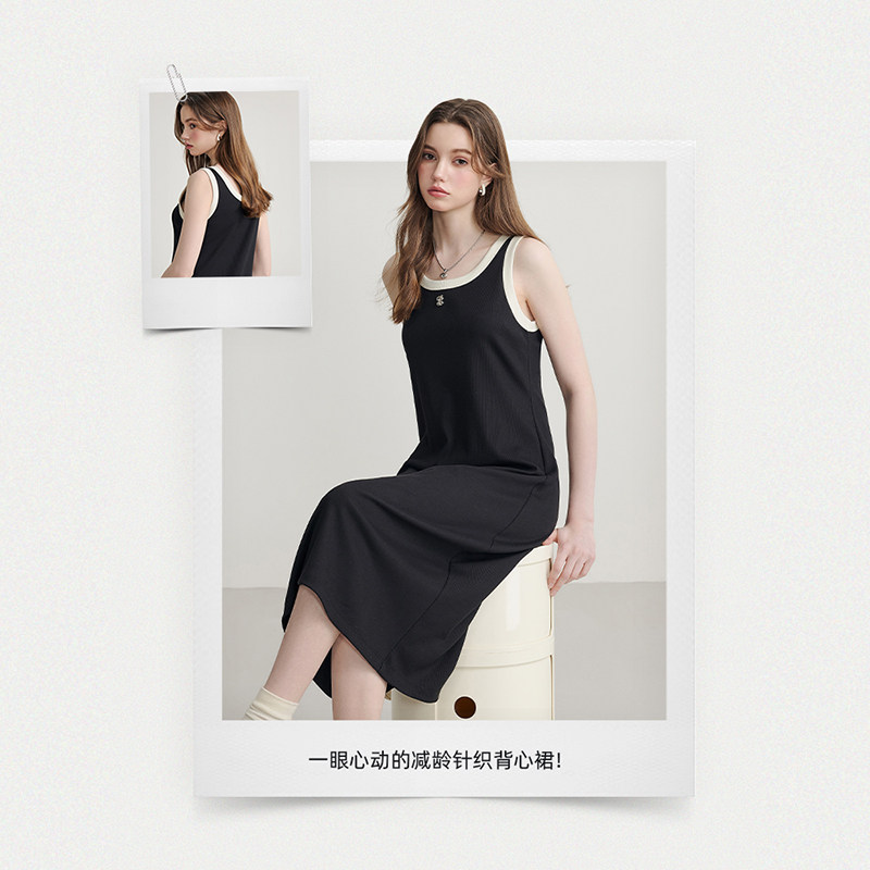 KBNE黑色背心连衣裙女撞色长裙春秋新款小个子针织宽松显瘦裙子