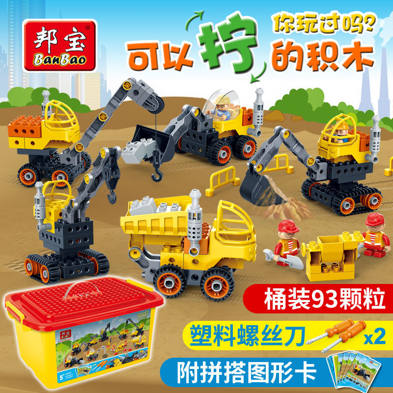 邦宝6539拧螺丝工程车96大颗粒拼插玩具车挖掘机吊车飞机积木玩具