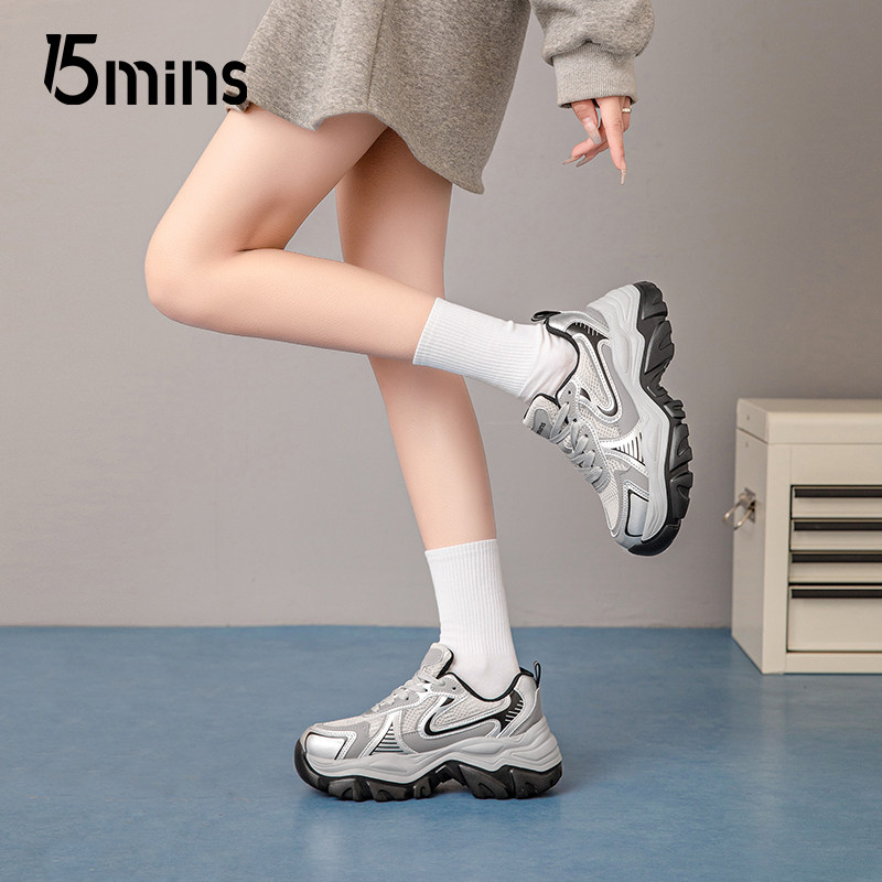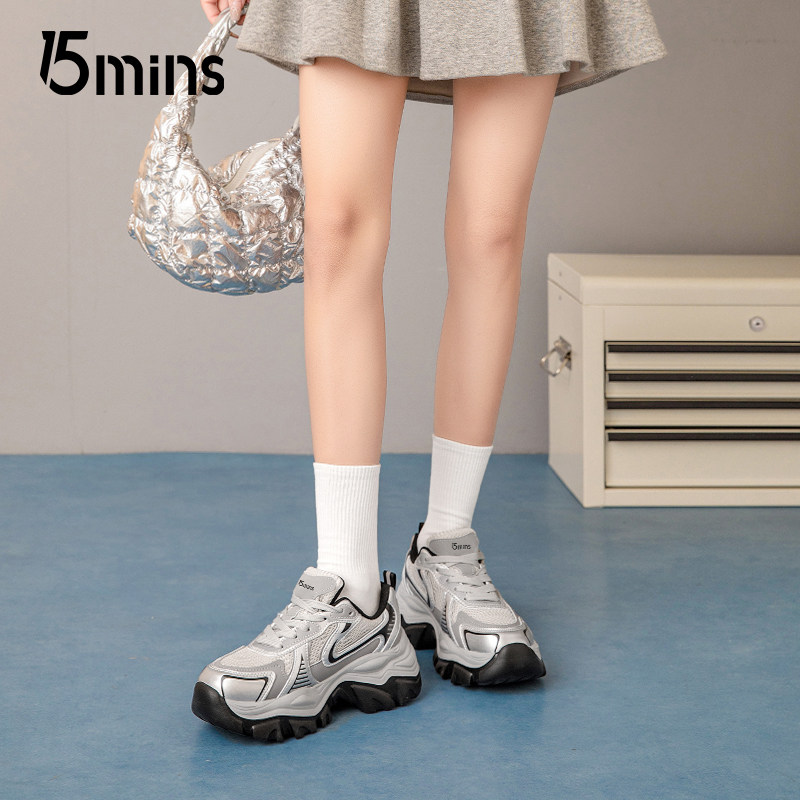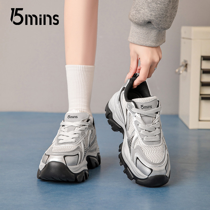 15mins厚底银黑色老爹鞋女款2025新款夏季透气增高登山户外运动鞋