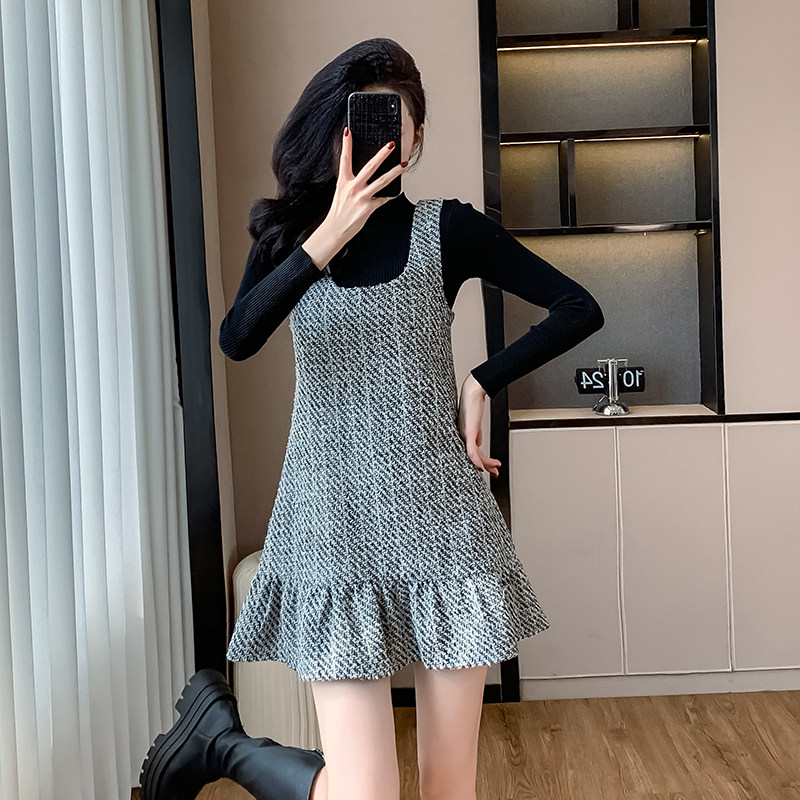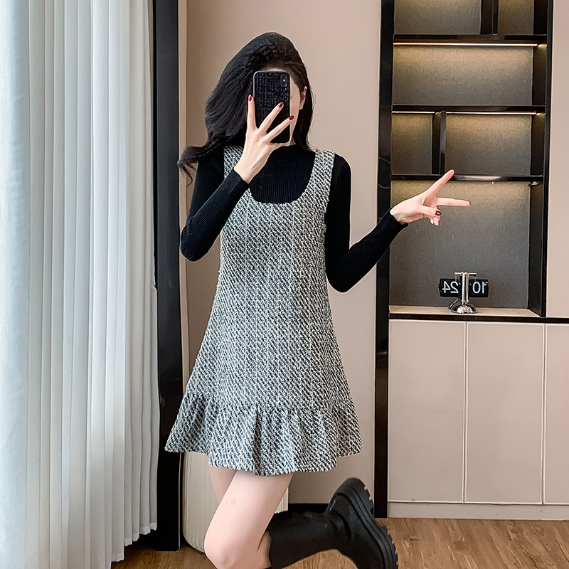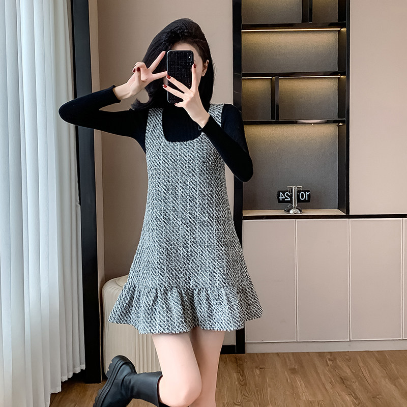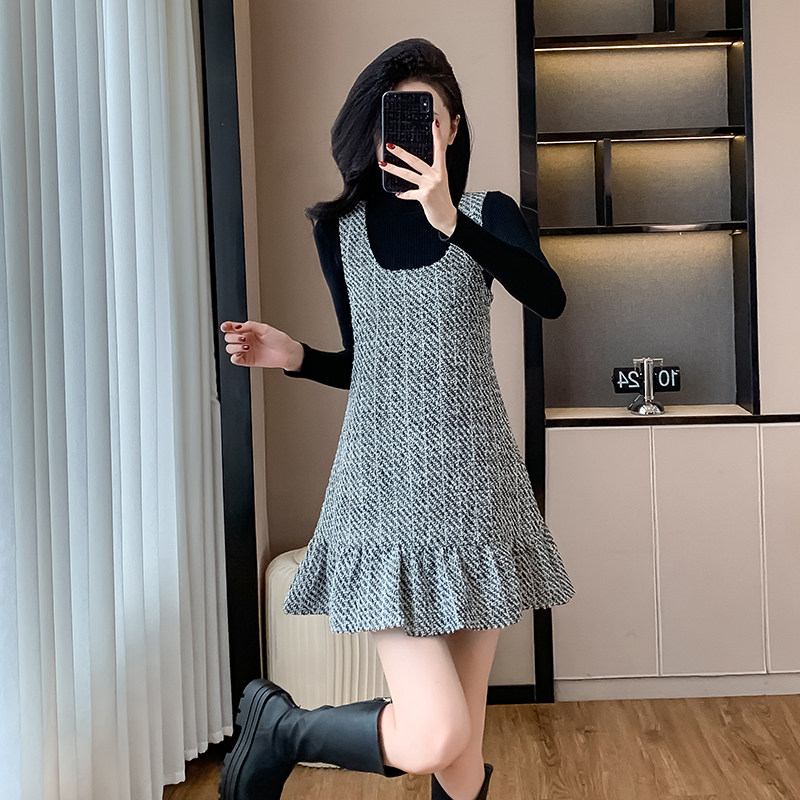 小香风背带连衣裙套装女秋冬新款高级感小个子荷叶边背心裙两件套