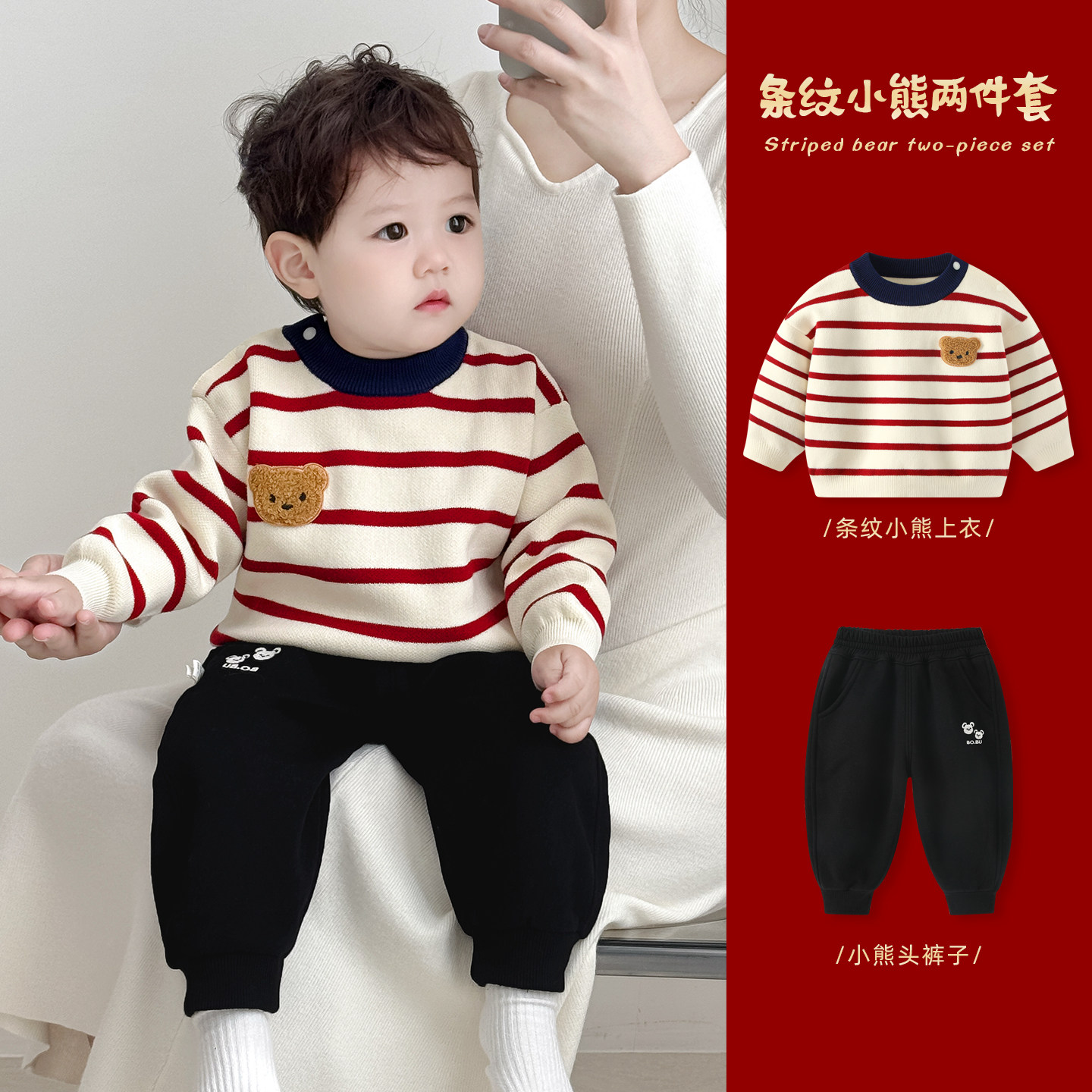 男童年服秋冬毛衣男宝宝加厚内搭上衣儿童冬装红色喜庆新年拜年服